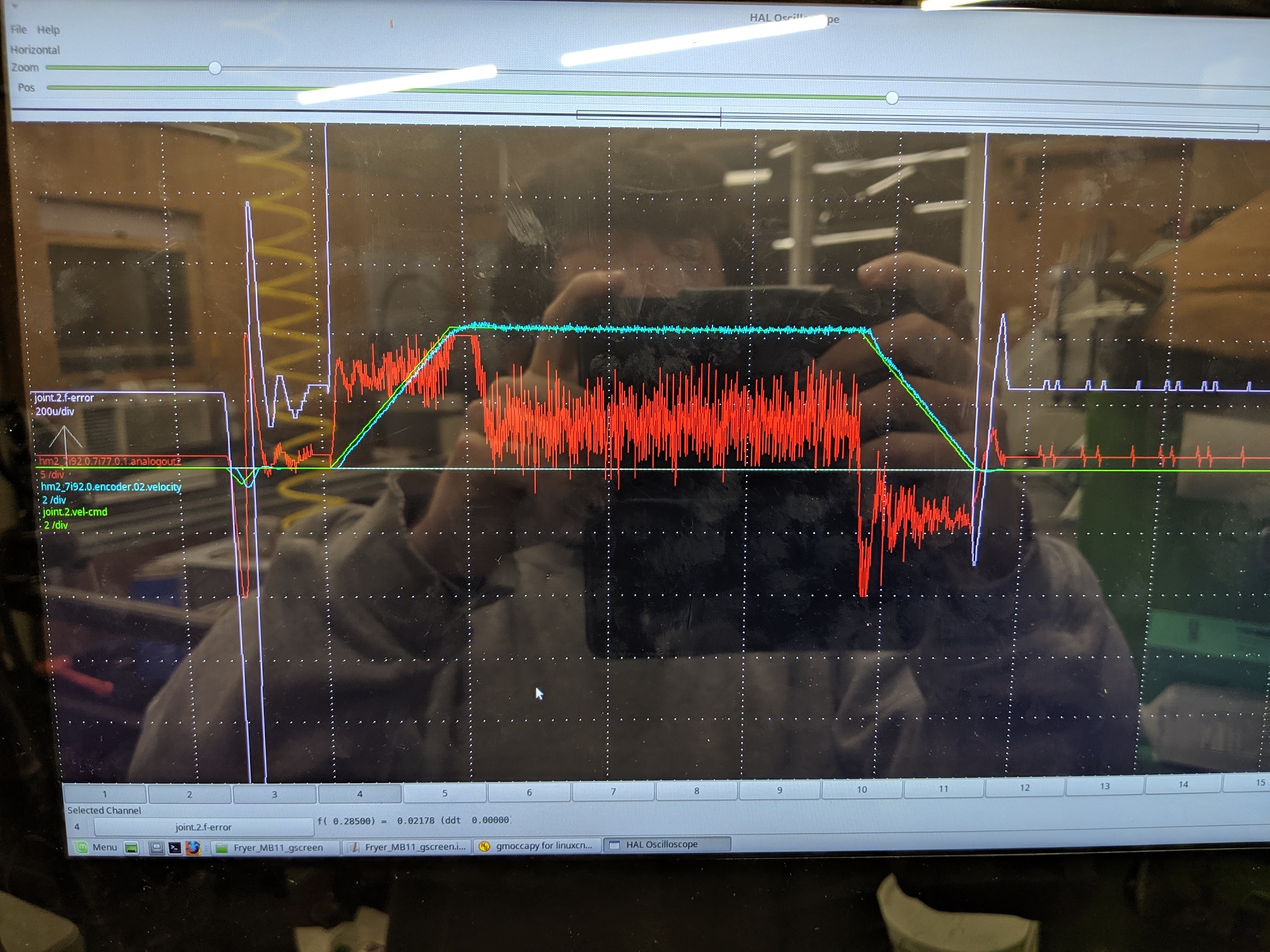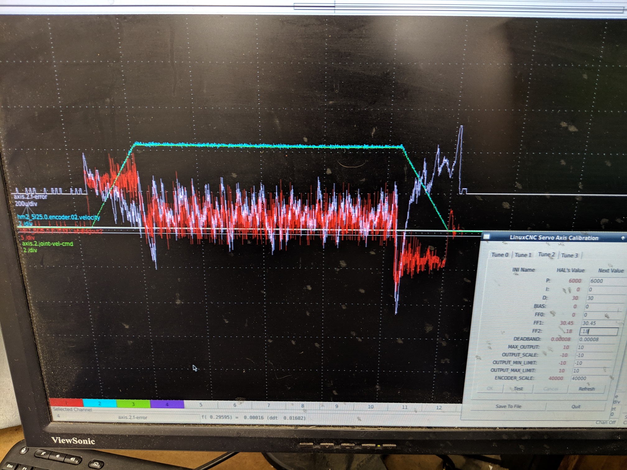 I have tried re-tuning the new computer and was not able to get the error into an acceptable range. It seems to always follow the commanded position. For an example, Original P gain was 6000. I got all the way up to 12000 and still had a very large error. If Im reading the values at the bottom of halscope correctly, 10 thou error.