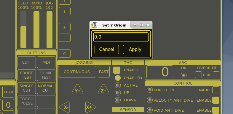 With Plasma, we only really need one coordinate system so we use G54. So when we touch off with the GUI buttons to set X0 Y0 we can also do it in the MDI window by typing G54 X0 Y0.
