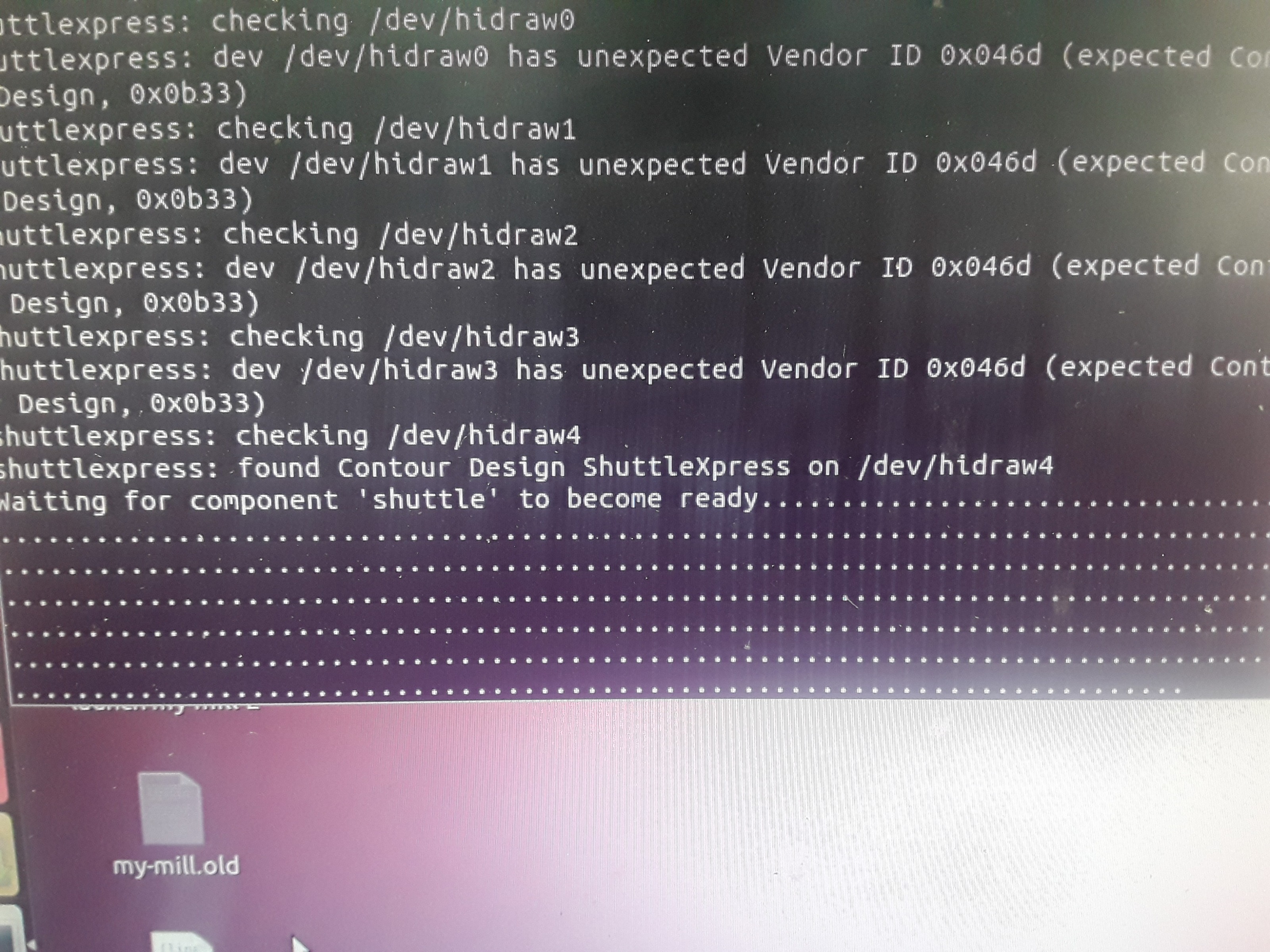 Thanks. I am making some progress. Now there is something with the "shuttle" not being ready. I tried to start the program, the splash screen comes up then goes away. I waited several minutes and tried to launch again. I get the box that says Linuxcnc is already running, start anyway. Then I get two error report windows. i think this is where i need to look. The device ID on highdraw 1-3 is my wireless mouse.
