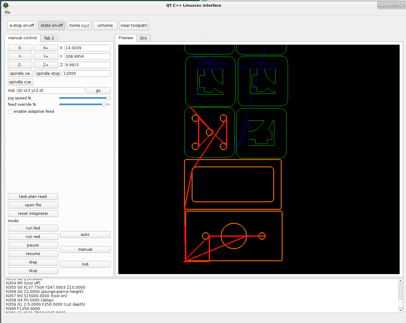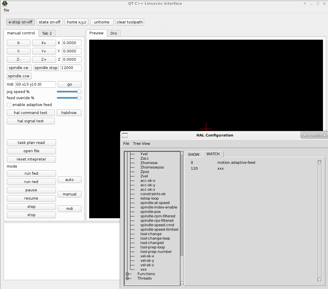 3. The most of the gui buttons and sliders are working except : spindle + and -, program reload.