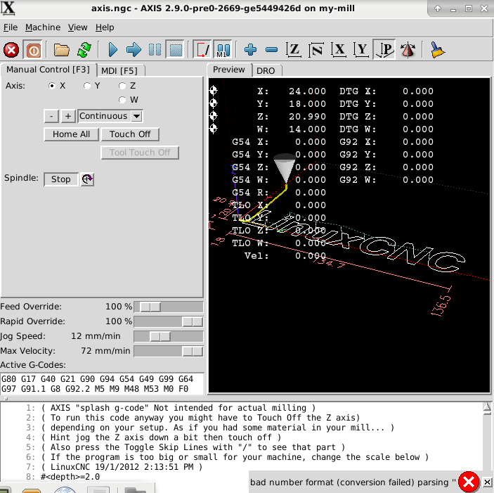 Hello, I am trying different things with the configurations of my whb04b-4 pendant and for example I would like to move my Z axis to 10 and W axis to 20 when I press the macro-10 button, so for that I wrote the following Gcode command on the ini file: MDI_COMMAND= G1 Z10 W20 F4000. But when I try it I get the bad number format(conversion failed) parsing.. error.