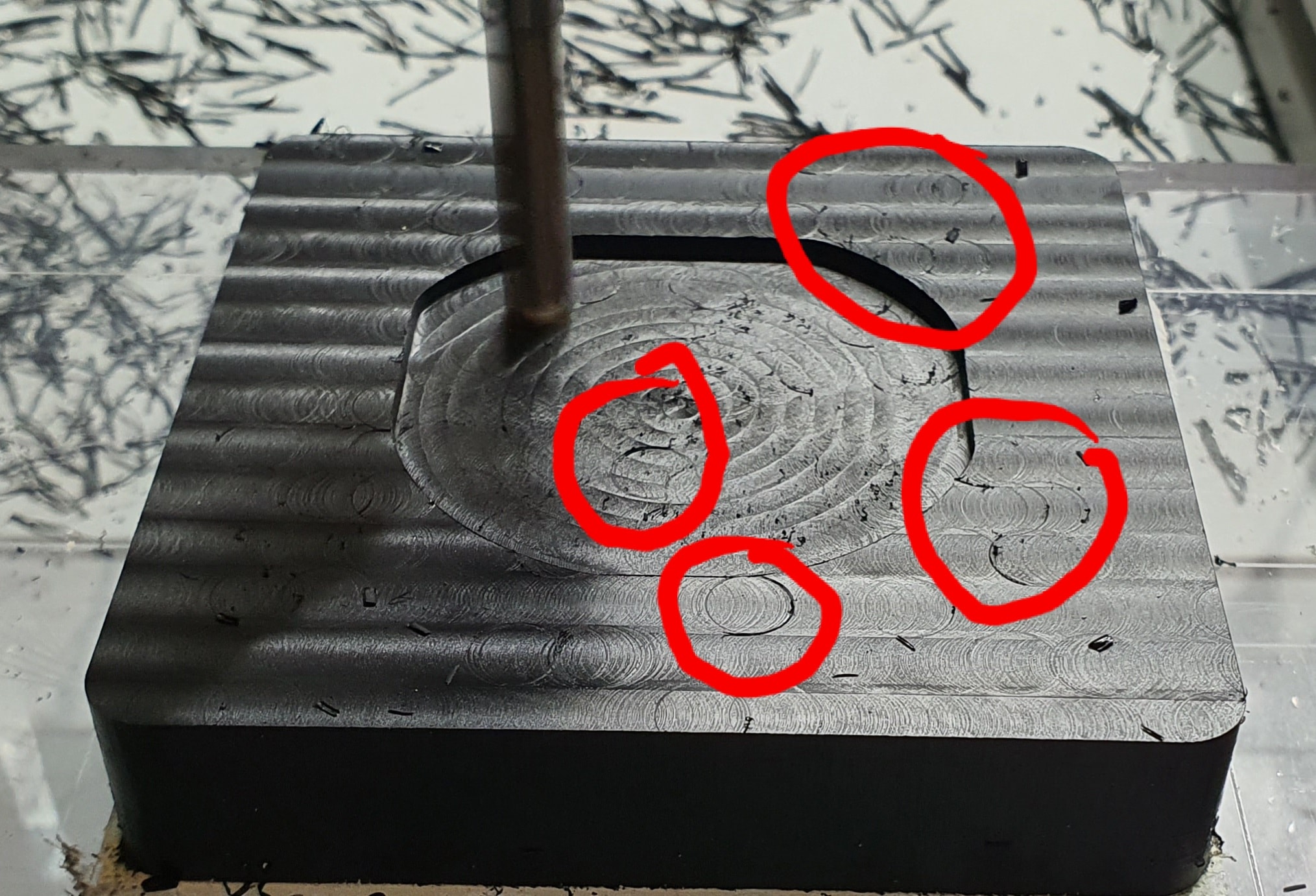 I attached a picture and have highlighted in red where the stutters have occurred during a facing toolpath. This was a 1mm DOC Pass in HDPE @ 1250mm/min - It cuts like butter.