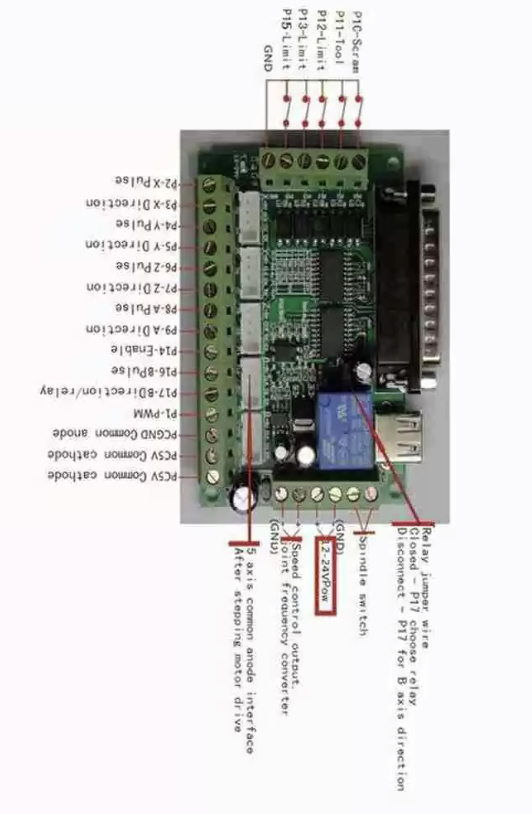 7, open all 17 ports, which can be accessed with the optocoupler drive, 5-axis stepper motor can be controlled.
