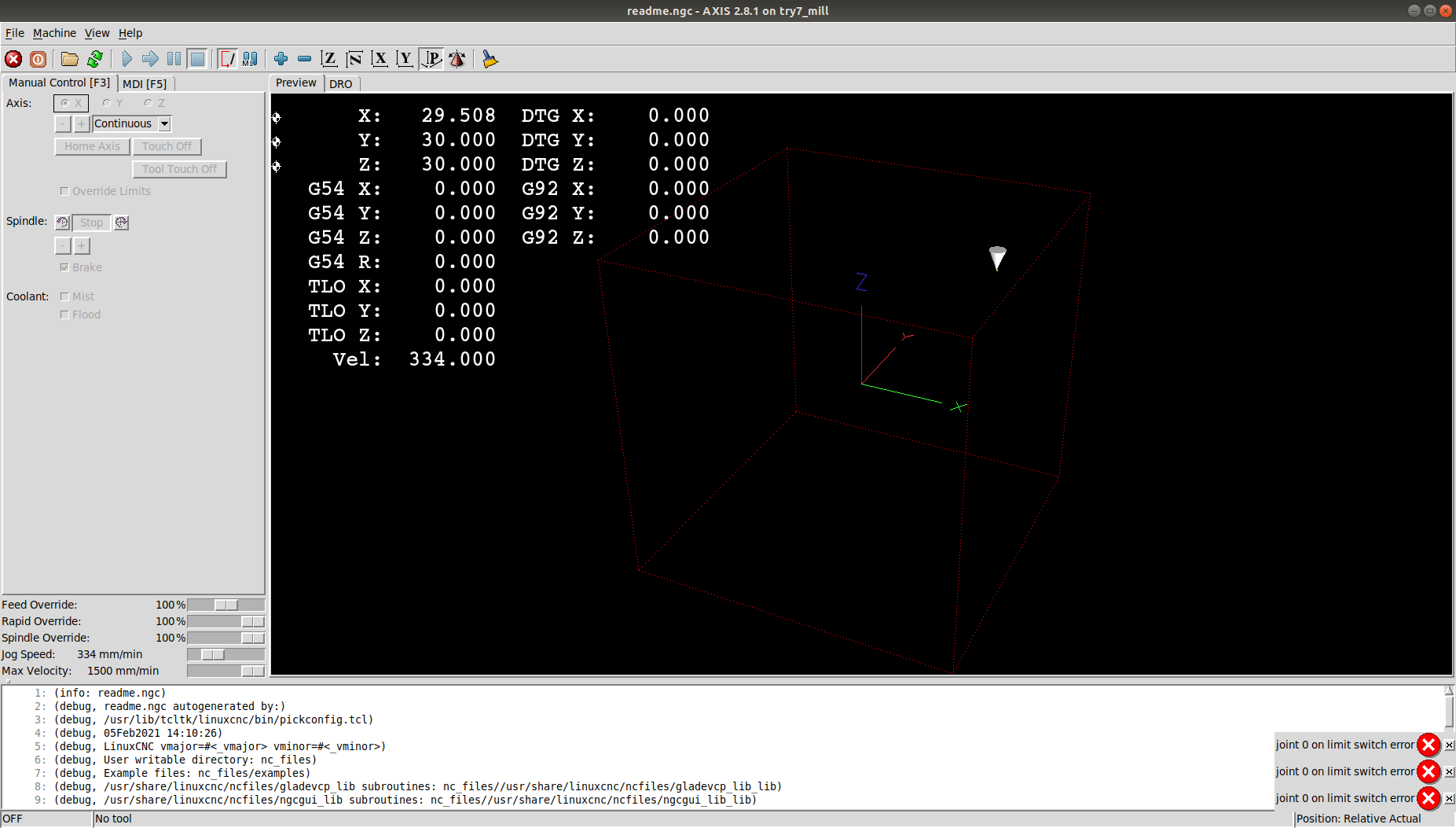 Now I want to connect my simple normal closed type limit switch for x axis only for testing to the mesa 7i95 card. but it gives "joint 0 limit switch error". If I remove the negative X limit setting, it's working fine in jog/MDI mode. It seems I have error in setting home location (30,30,30) position and limit switch position setting. I have attached all the wiring and setting.