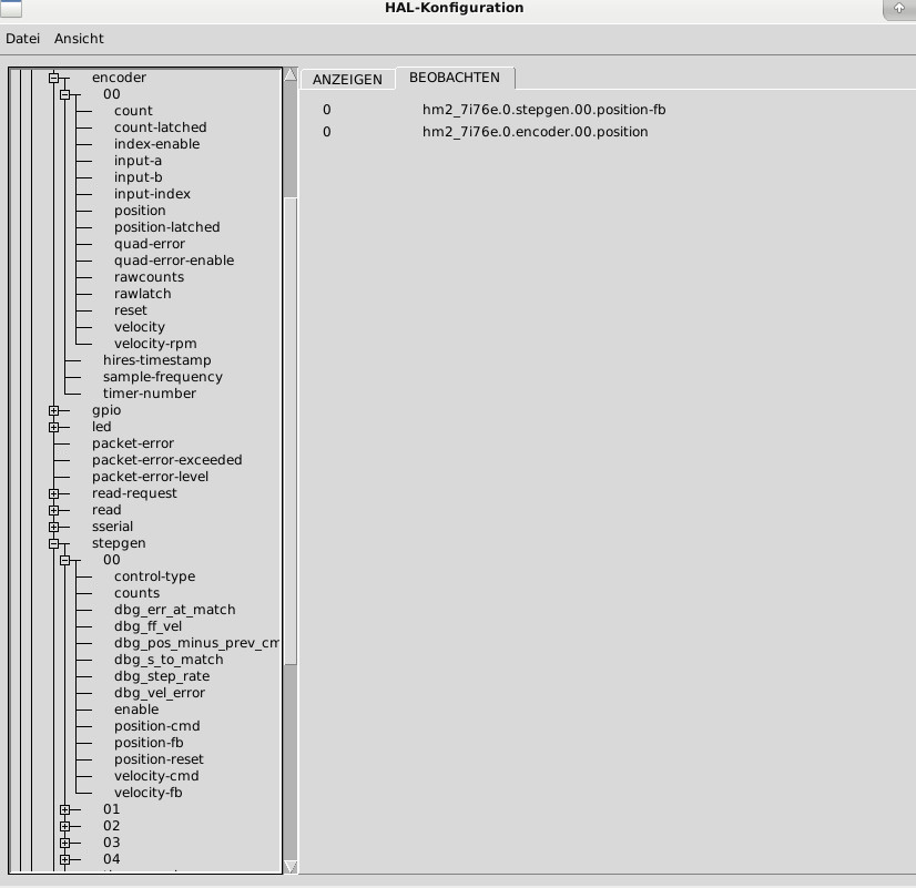 #net x-pos-fb <= hm2_7i95.0.encoder.00.position # Encoderpostion to PIN x-pos-fbnet x-pos-fb <= hm2_7i95.0.stepgen.00.position-fb # Stepgenposition to PIN x-pos-fbThen compare encoder position and step position. They have to be the same if not adjust your scale parameters. Verify the whole thing with a dial indicator.