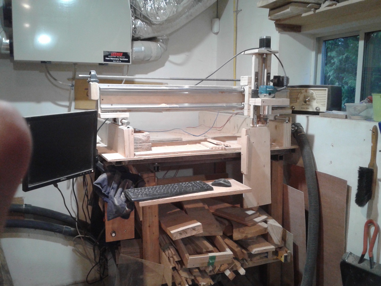 Simple gantry X,Y,Z machine. 24V Nema 23 Motor's, 1/2 inch acme lead screws, 8:1 screw. Old Dell computer with parallel port. Mikita compact router for spindle