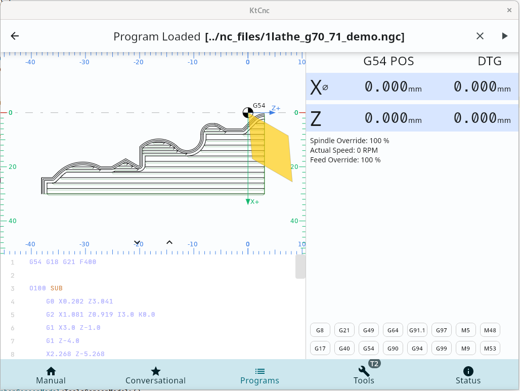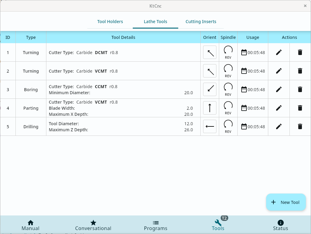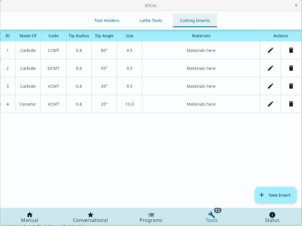 My lathe has a front tool post, with a multifix toolpost. And since only 16 tool holders and way more lathe tools, I decided to make the software aware of that. Therefore you can have a list of tools, and you can associate a specific tool with a specific holder. Only at that time a tool has offsets and its ready to be used. Also the lathe tools can have inserts, and those inserts have feeds and speeds for the materials they were designed to cut.Therefore I included all this info in my custom tool library so that I can use it further when I will start to implement the conversational logic, to suggest cutting parameters between a min-max range.