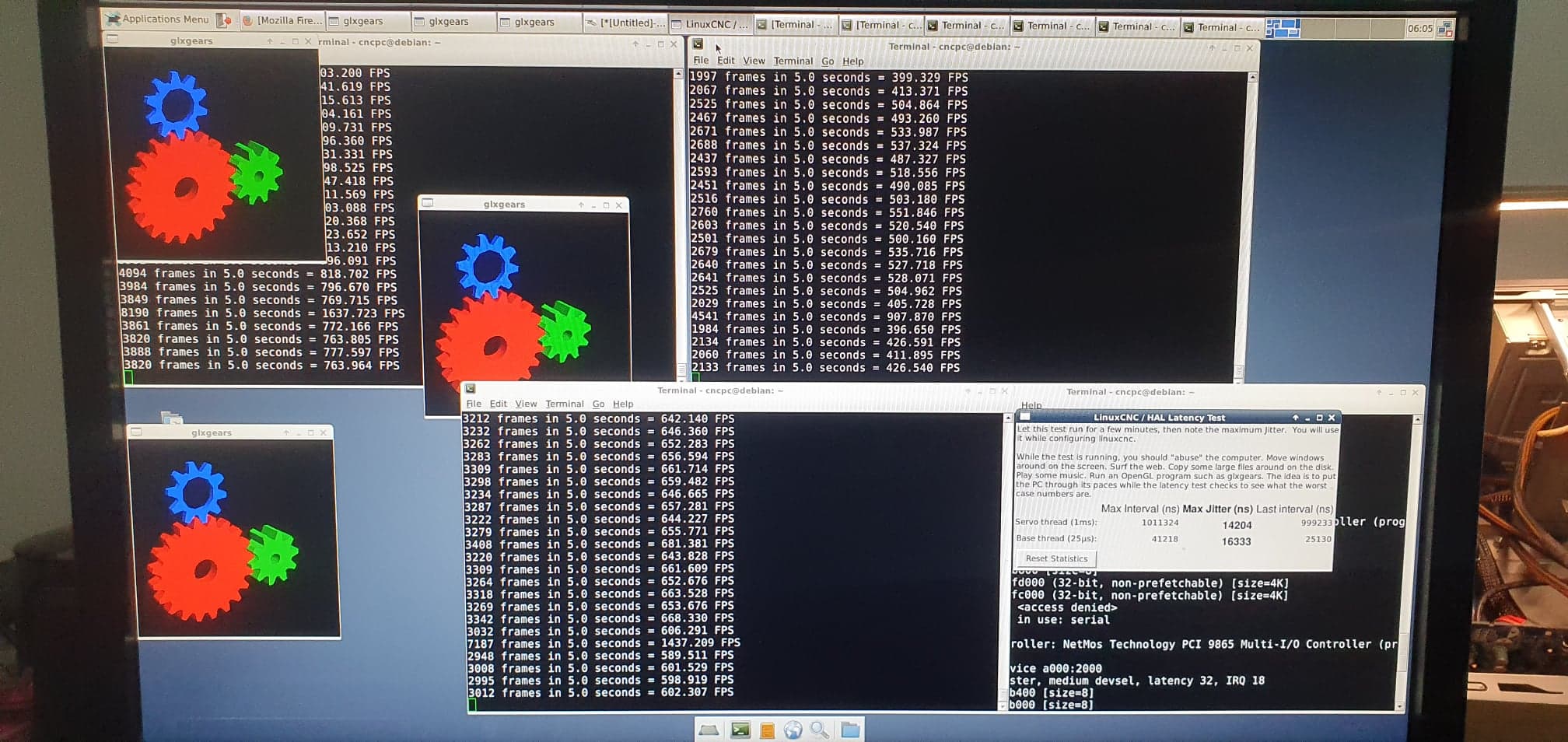 I was also facing latency spikes as soon as i started GLXGEARS (from 5000 to 180000), so i installed a GPU, changed bios settings and now after running for 2h with 3 x GLXGEARS, the latency were at 16000. It was at 6000 for a long time, but the screensaver was on when i came back and then it was at 16000. Not sure if screensaver could create that spike from 5000 to 16000, but its still good.