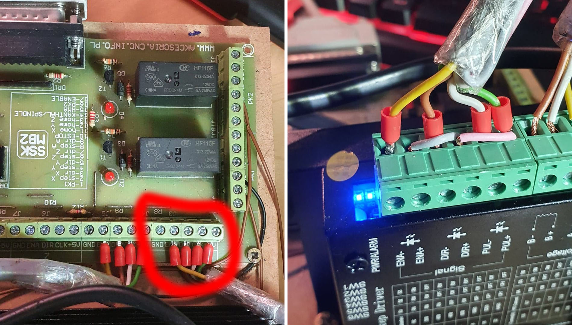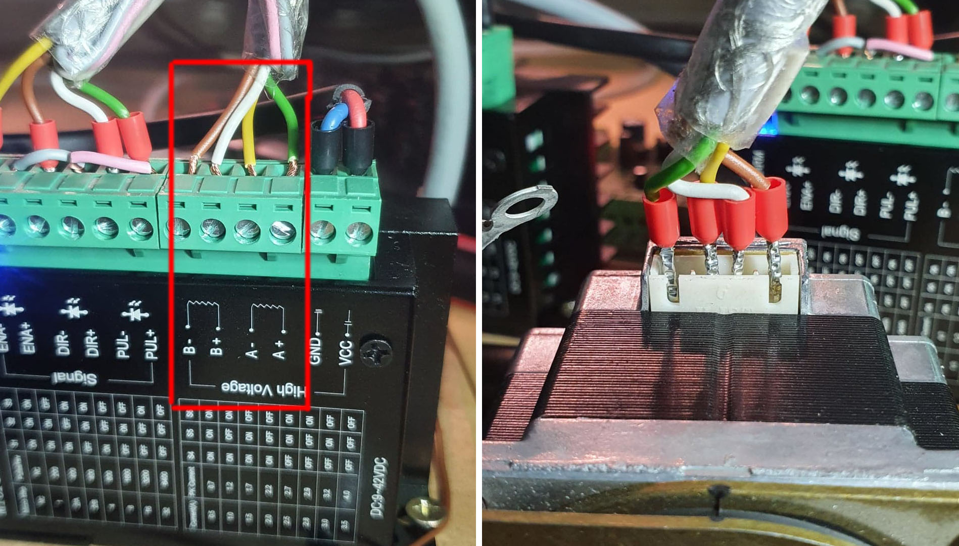 I have tried a lot of different wiring setups, but the current setup (which can be seen on the pictures), powers the motor when testing the axis in STEPCONF. Its difficult to move, but the motor just wont turn.