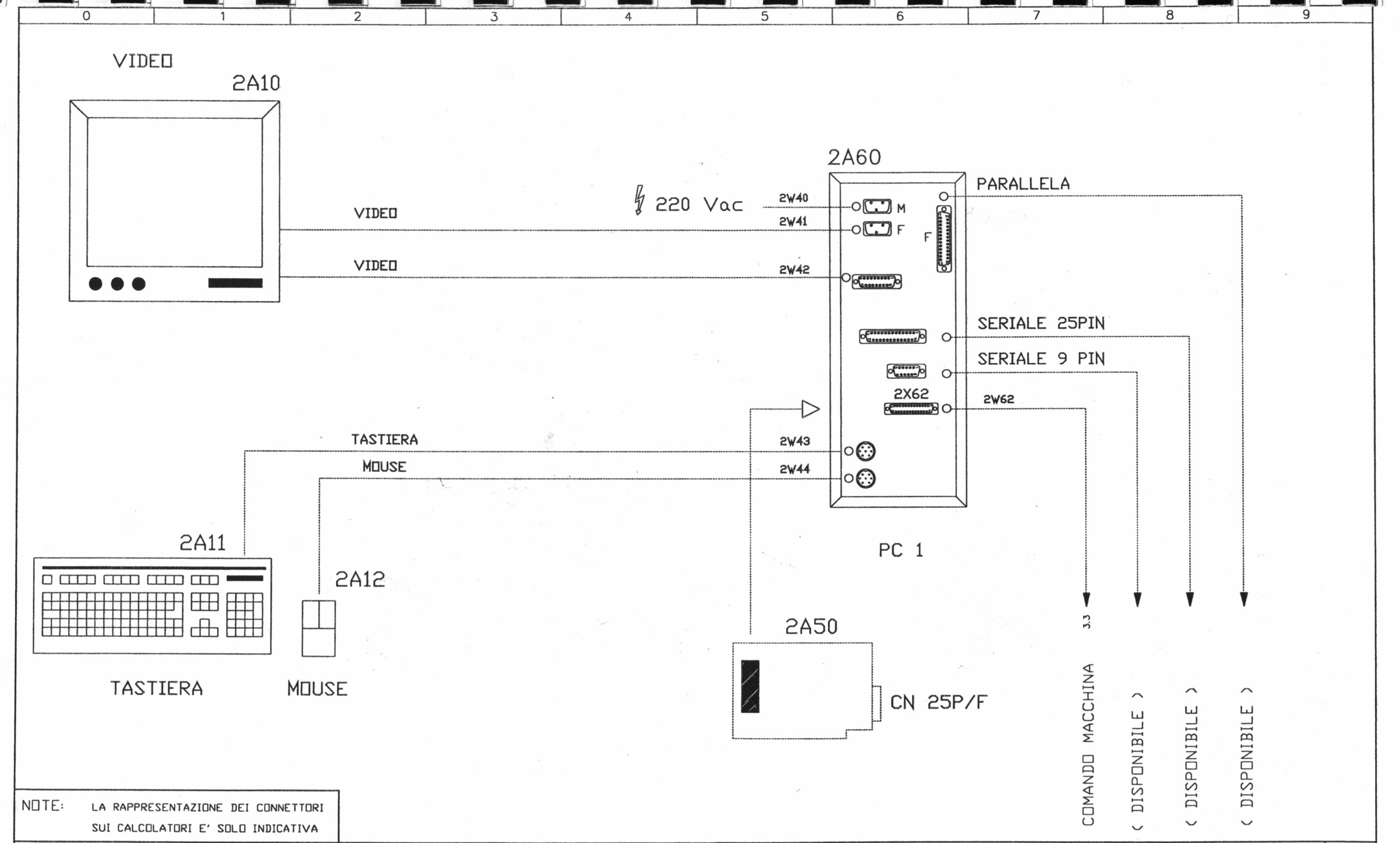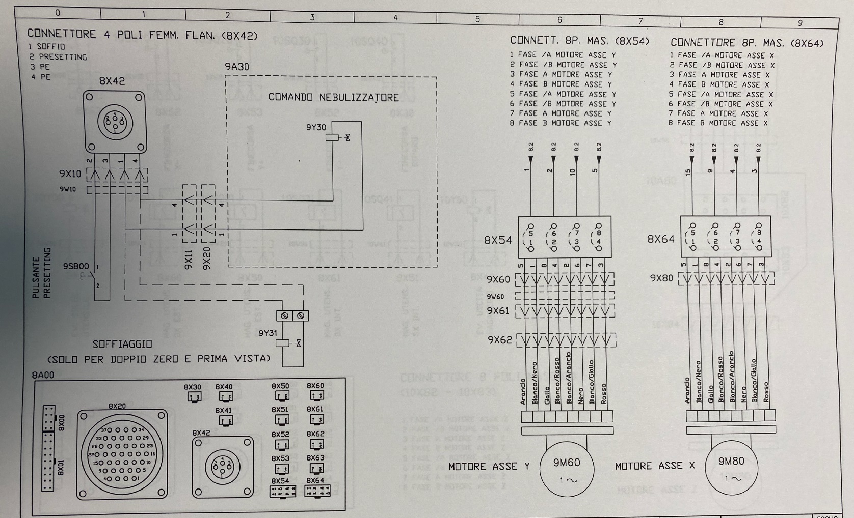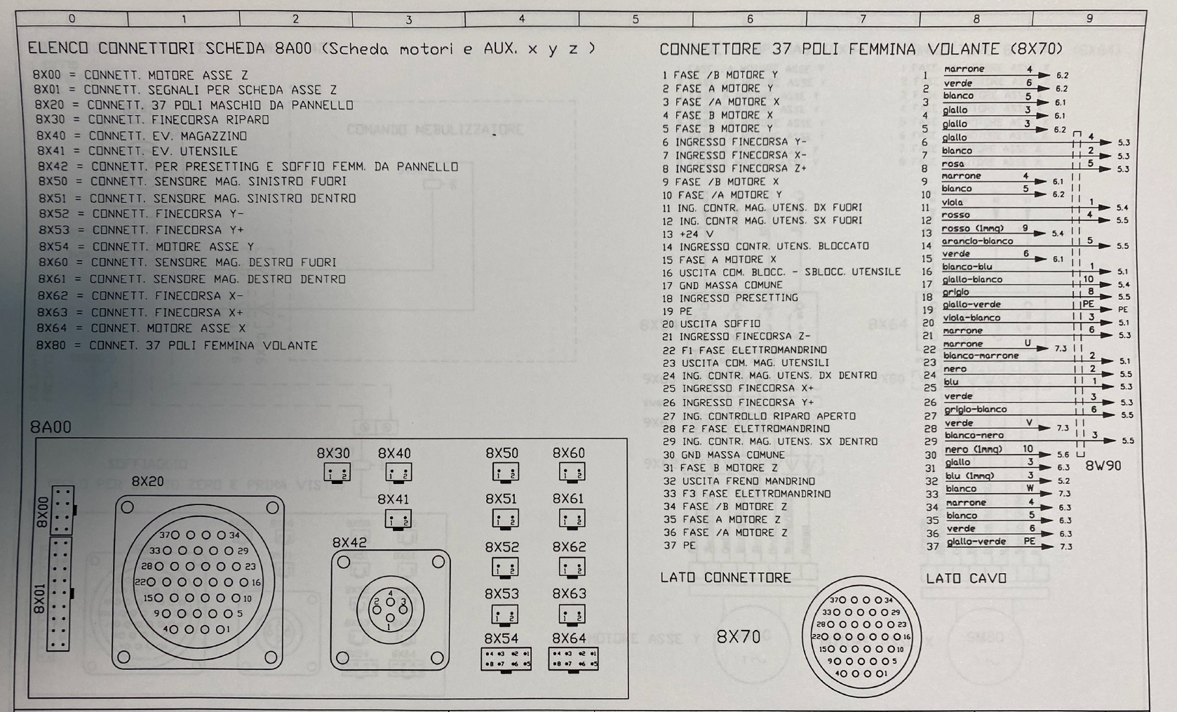 The pins in green are my guess but I am small in electronics. I assumed that the numbers in green correspond to the pins of the two 2x62 and 2x63 cables that carry the signals from the PC to the machine in photo(configuration.jpeg). I am attaching the rest of the schematic if you can figure out how I can connect the pins. Theoretically the serial cables db25 and db9 named 2x62 and 2x63 that come out of the cabinet of the machine are the cables on which to make the bridge for linux. The problem is that I can't find the pinout of these. Without knowing what controls the pins I don't know how to connect them and which breakout board to use. In the meantime, thanks for your help