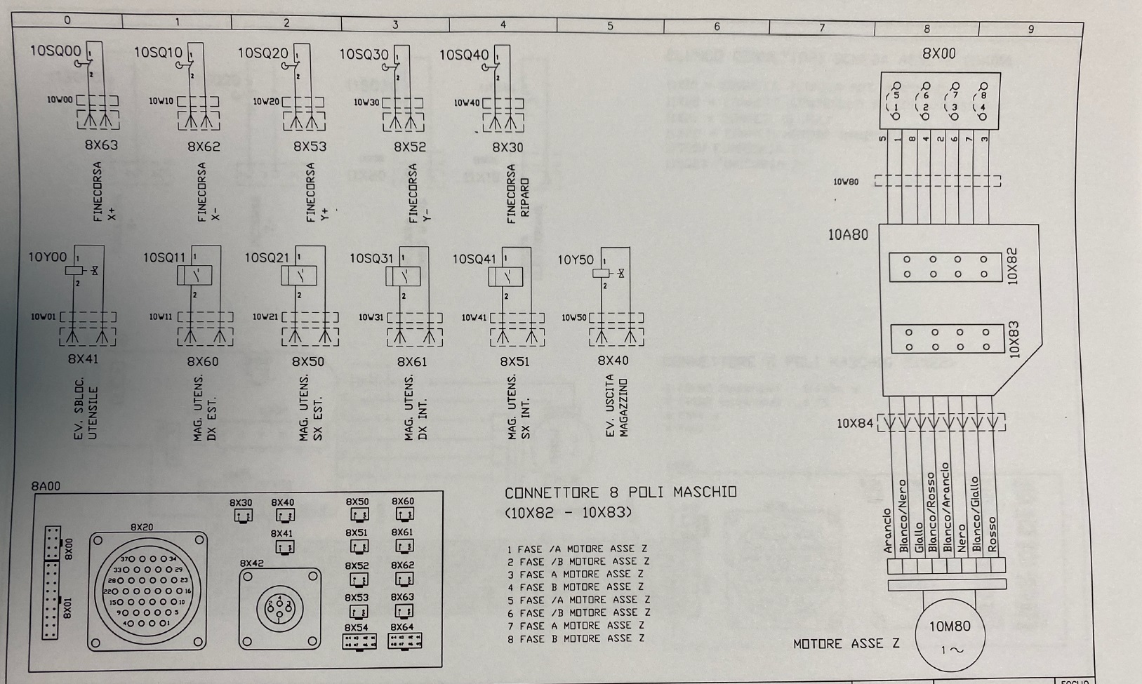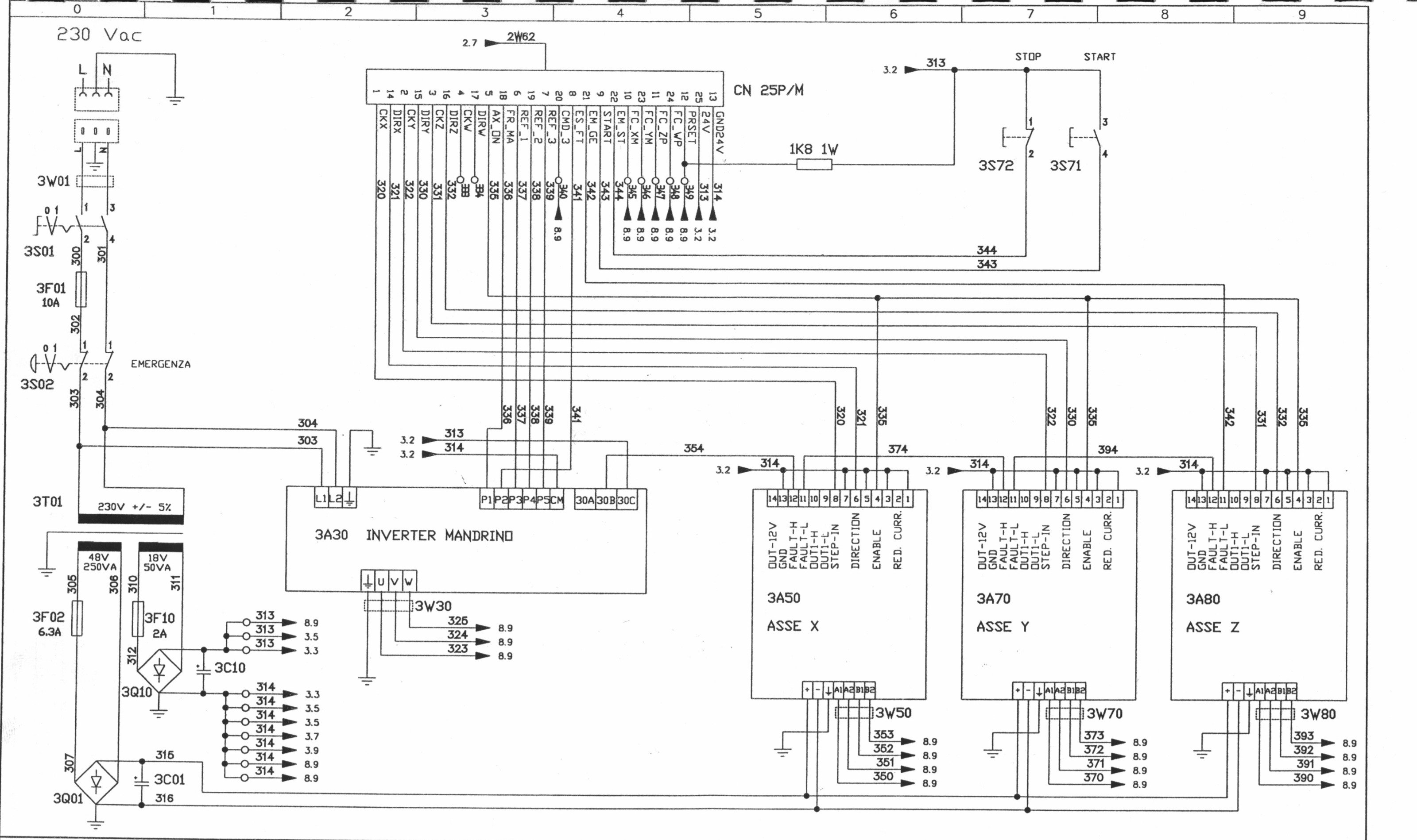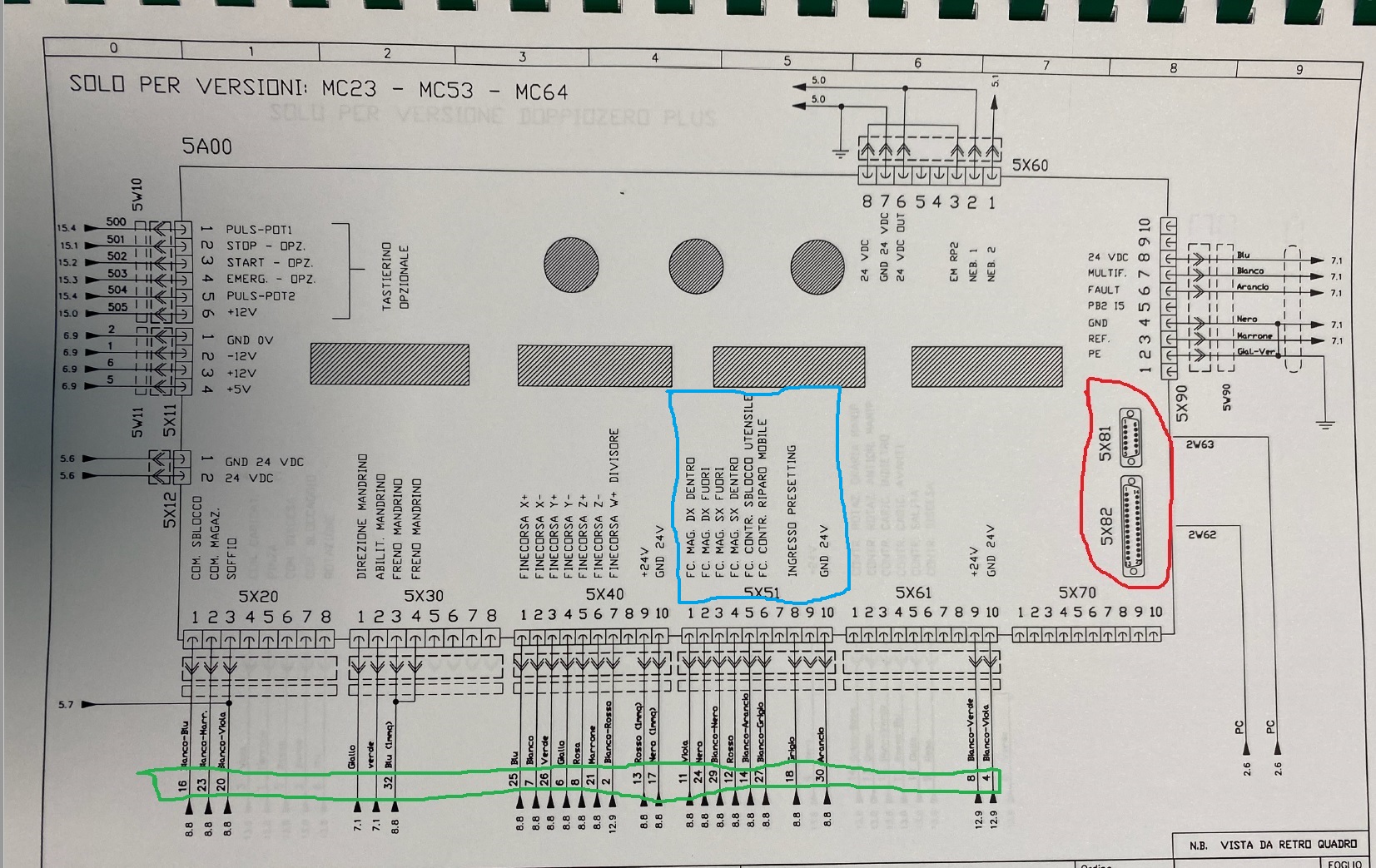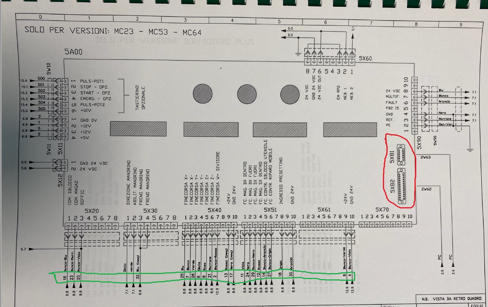I would presume that the 24V (signal 3.2) is supplied from the "Inverter Mandrino" 3A30. So if our assumption is correct and the 25pin connectors have the same pinout on both machines you should be able to measure +24V between pins 25 and 13.