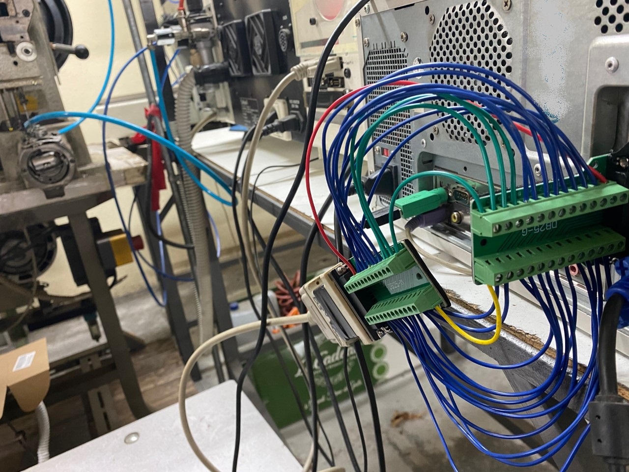 I opened the db25 to test the pins with the machine enabled. The blue cable in the photo corresponds to ground pin # 13, like the pinout that was in the diagram. I have tried the other pins but they have values between 2.2 and 2.8V which vary to 4V (ACTIVE HIGH) when I enable ANY tool change function, or x y z movement.