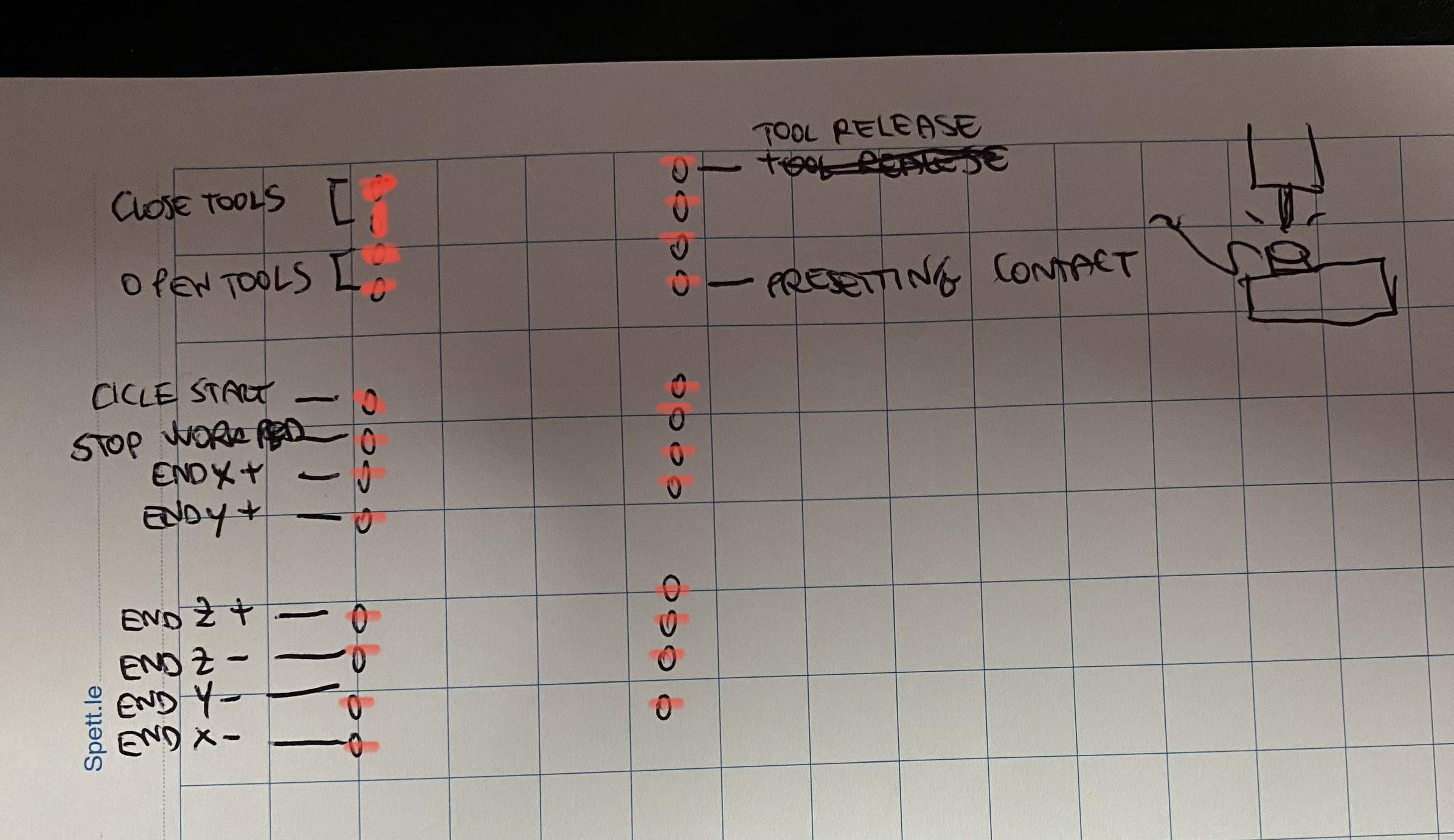 I have also drawn from the lights I still have to measure the inputs in VOLT, I am attaching a photo of the latter too. When I press the emergency stop all inputs are turned off. For the rest, I found almost all of the push-button panel, only the spindle potentiometer is missing. I have not found any traces of the latter, neither with the machine being worked, nor in manual control with active spindle. Neither on output devices.