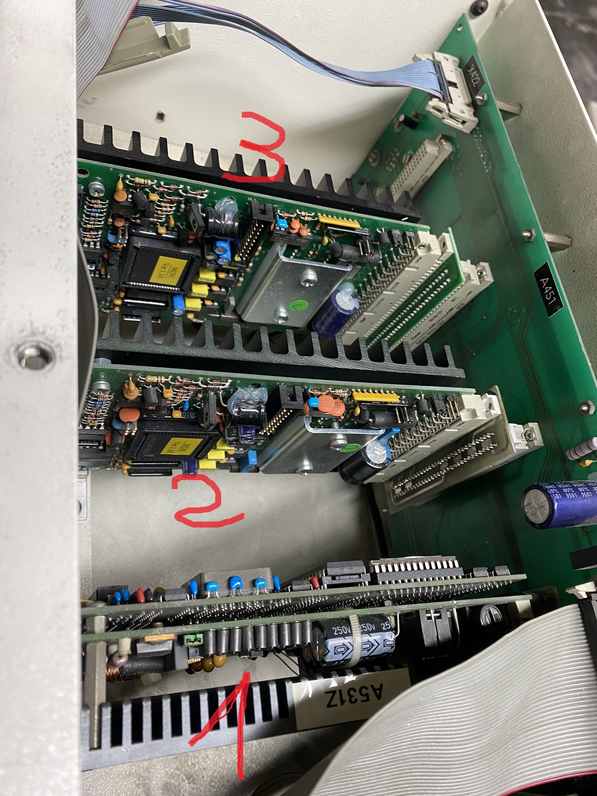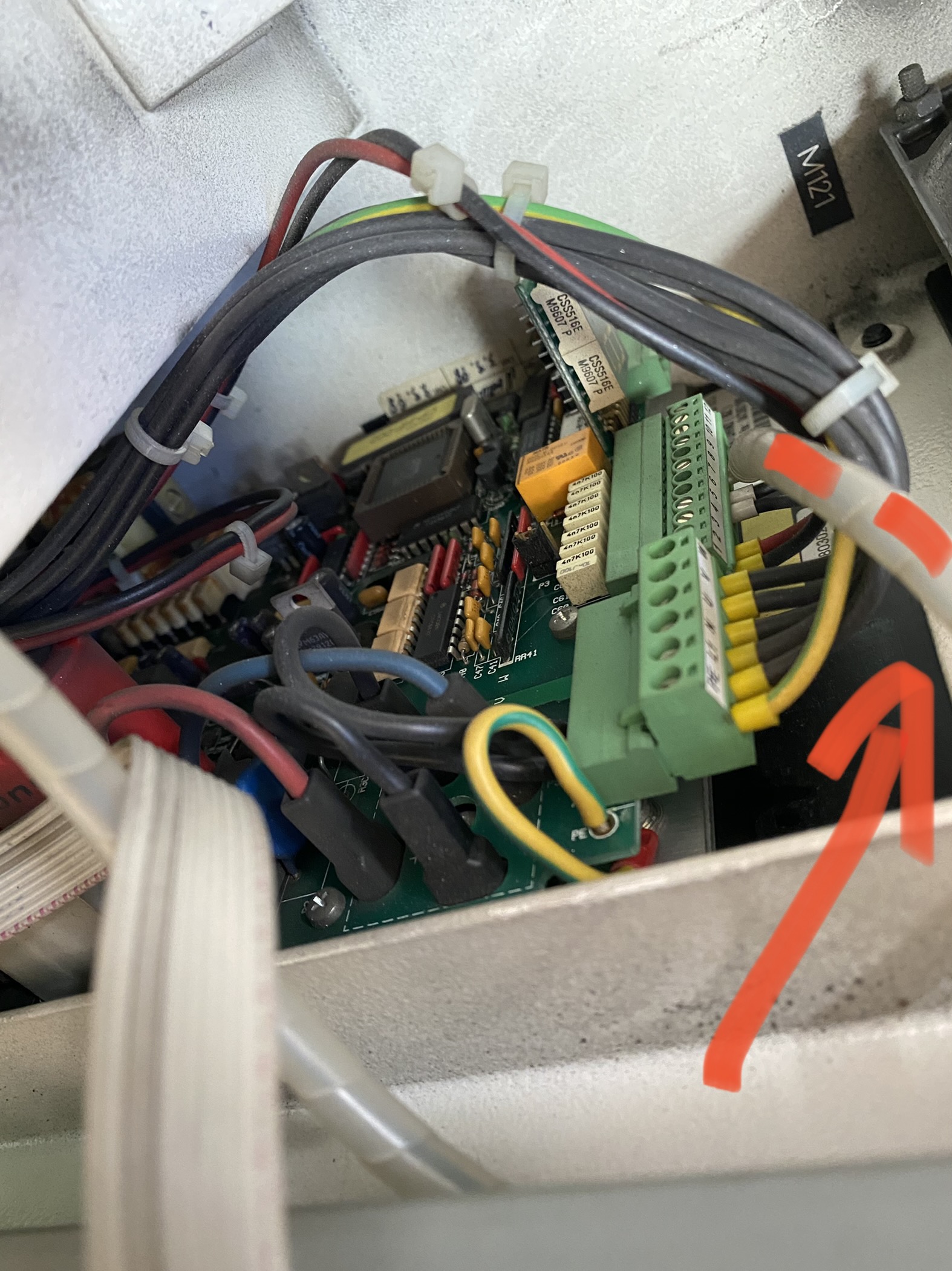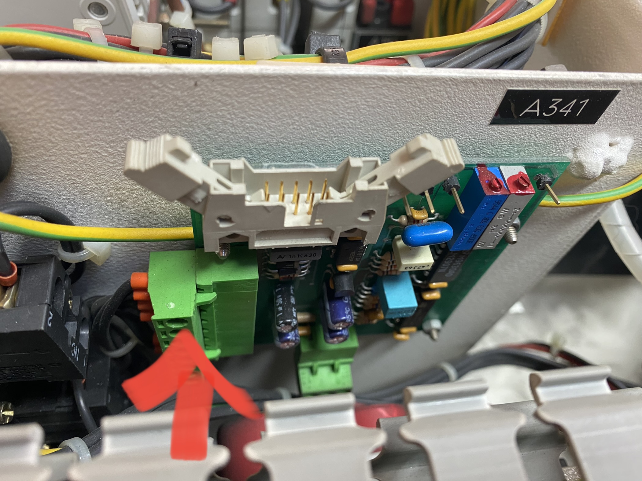 After the photos, the A341 card seems to be connected to the front buttons of the panel, I have already detected them as input devices, except for the spindle potentiometer. The flat cable coming out of this card goes to the large drive card, where the input and output flats are. I noticed that if I press the button to enable the axes at any time the machine clicks and they seem to remain enabled until the red emergency button is pressed. I found the pin that turns the spindle on one of the transistors, when I activate the rotation the value goes from 12 to 0, also on one of the relays I found the nebulizer command. The flat output cable clearly carries pins 2-11 from a yellow-green ground cable as we had supposed, the single cable protected by the plastic instead corresponds to the pin that turns the spindle. How can I find the spindle references. Do I have to disassemble some boards to better understand and take pictures?