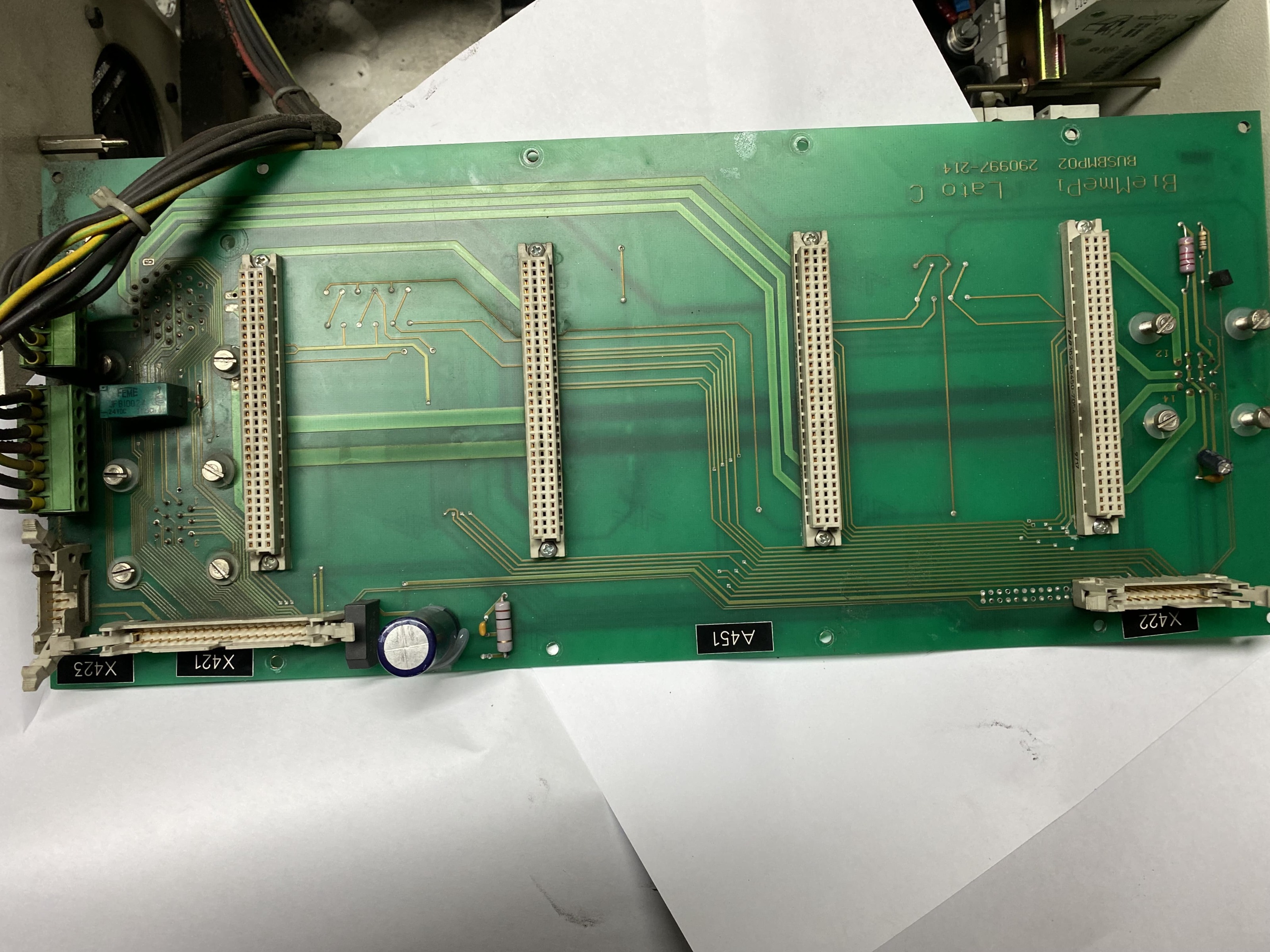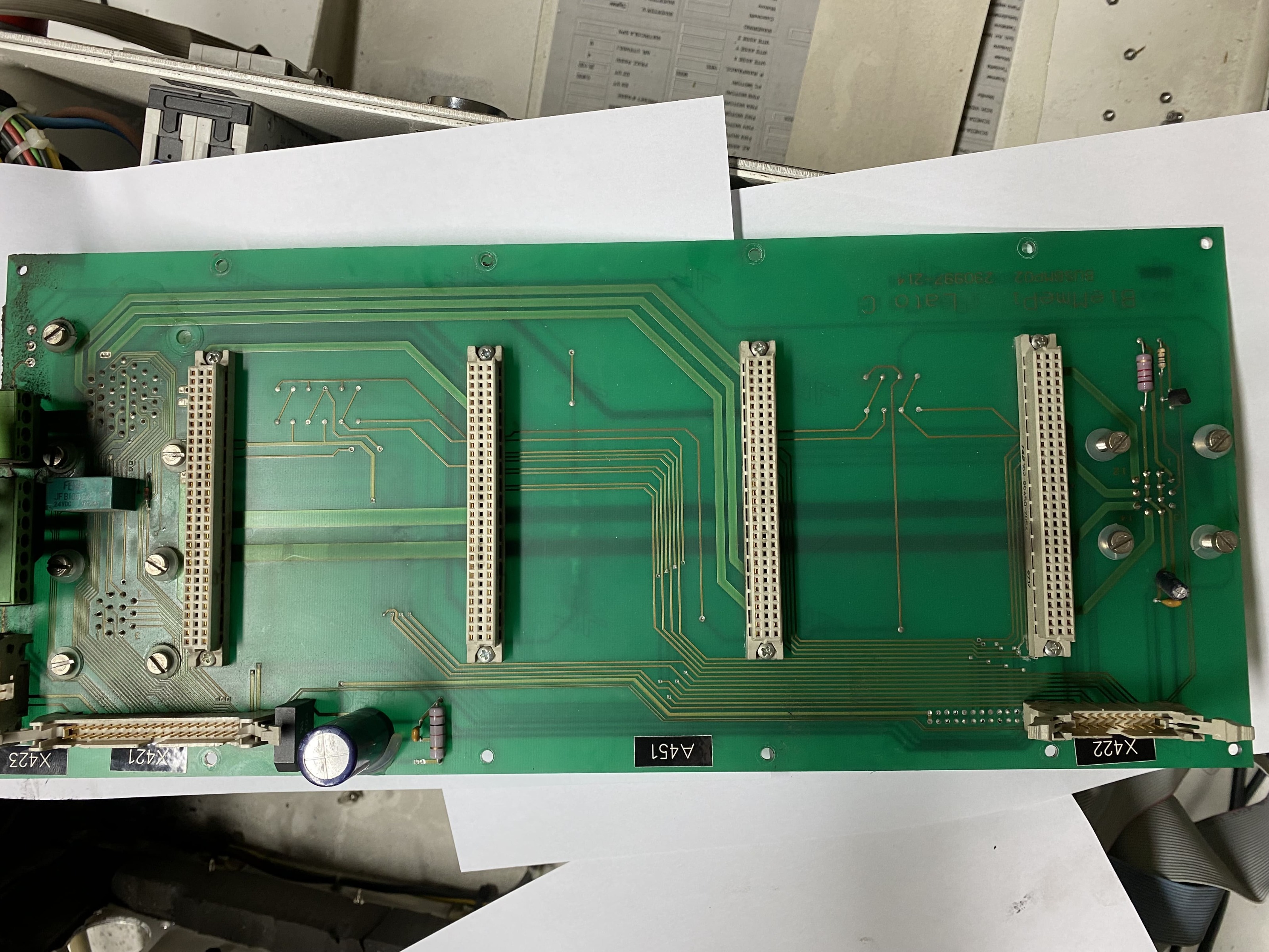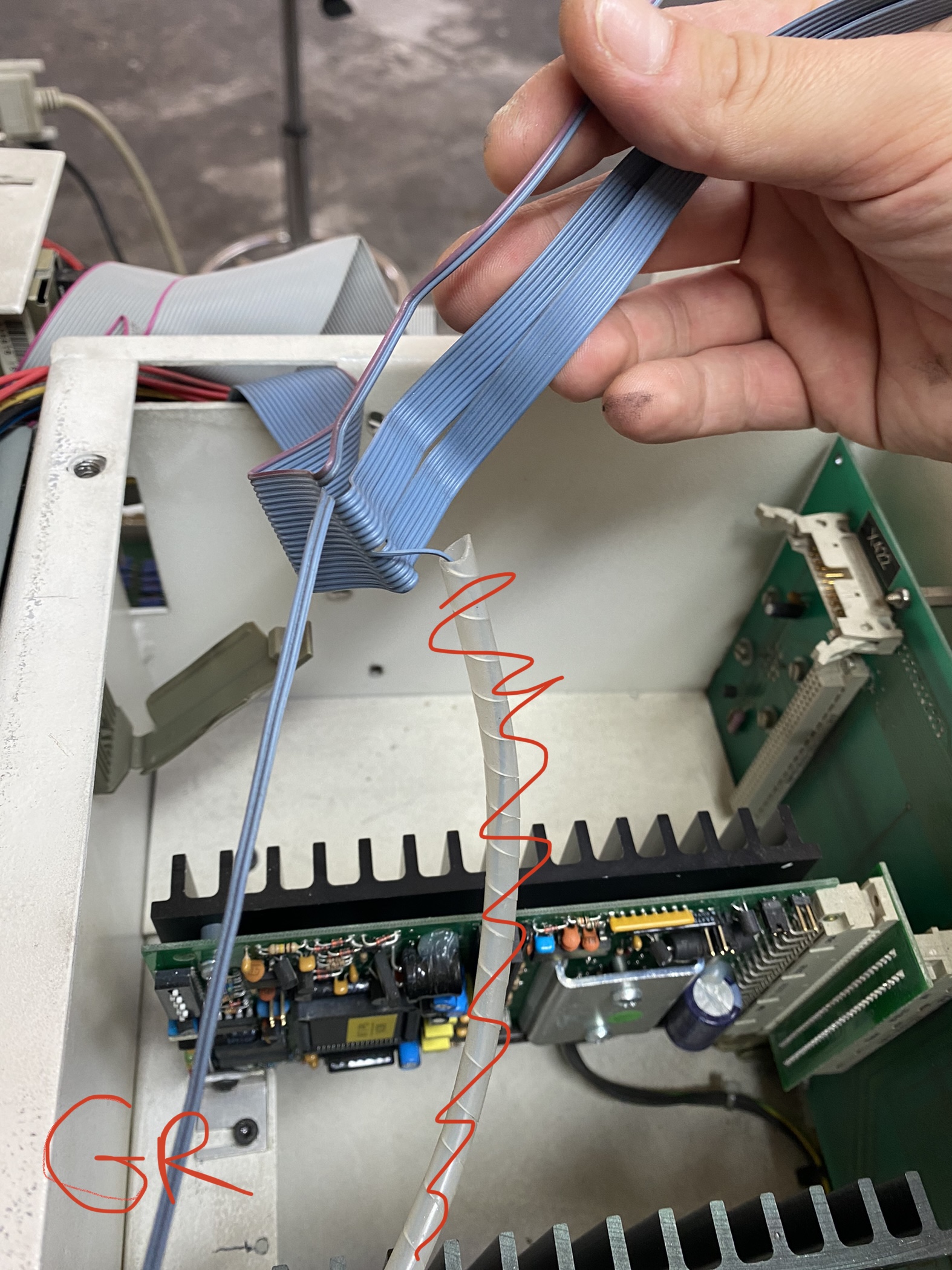 After the photos, the A341 card seems to be connected to the front buttons of the panel, I have already detected them as input devices, except for the spindle potentiometer. The flat cable coming out of this card goes to the large drive card, where the input and output flats are. I noticed that if I press the button to enable the axes at any time the machine clicks and they seem to remain enabled until the red emergency button is pressed. I found the pin that turns the spindle on one of the transistors, when I activate the rotation the value goes from 12 to 0, also on one of the relays I found the nebulizer command. The flat output cable clearly carries pins 2-11 from a yellow-green ground cable as we had supposed, the single cable protected by the plastic instead corresponds to the pin that turns the spindle. How can I find the spindle references. Do I have to disassemble some boards to better understand and take pictures?