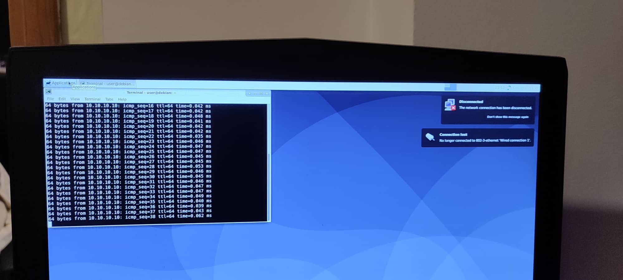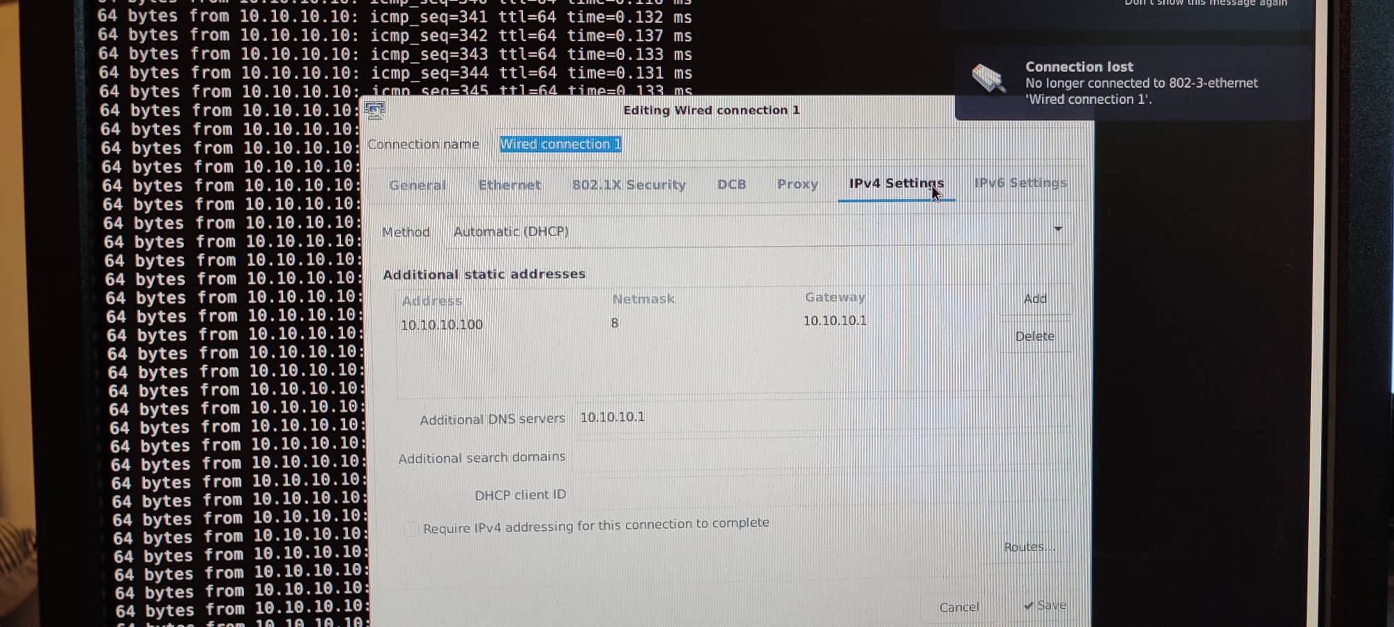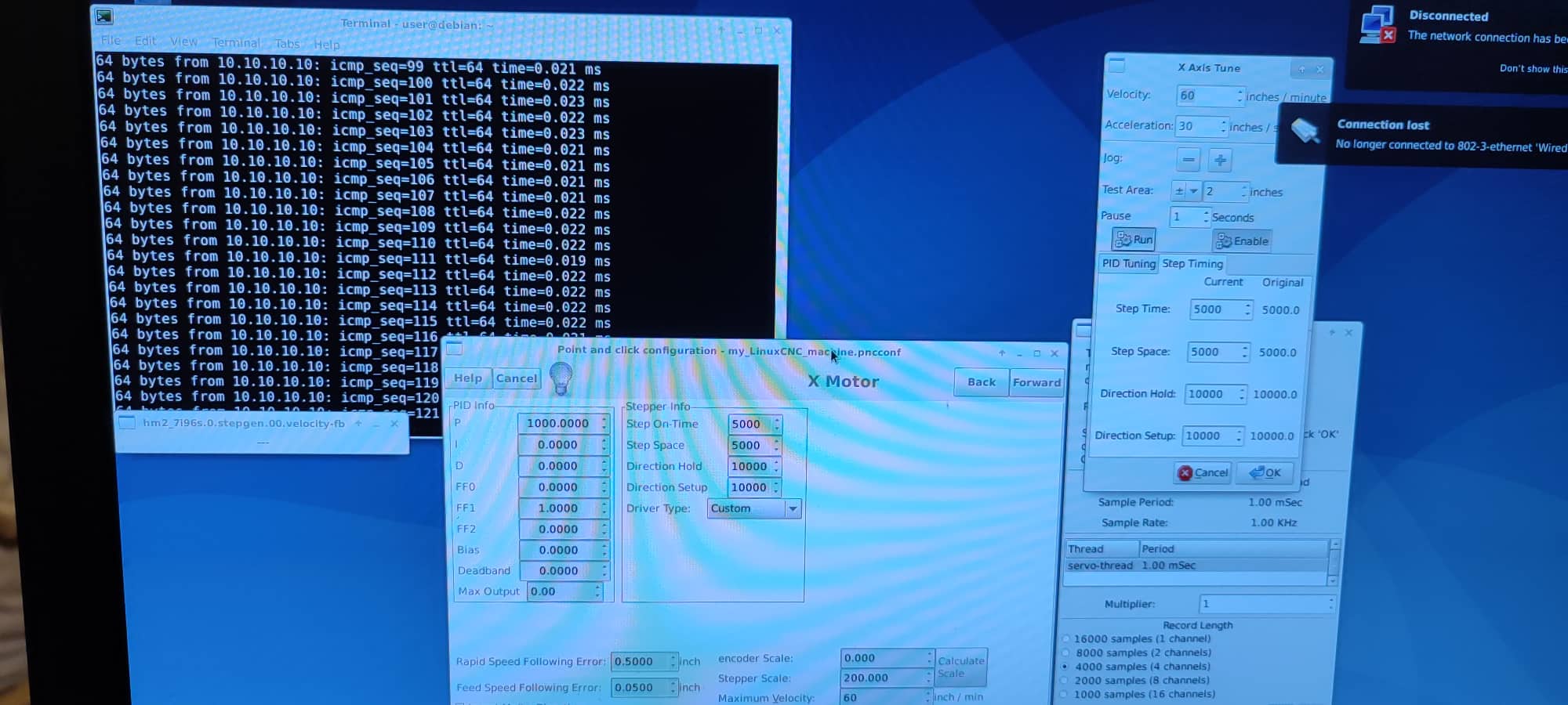 I have a mesa 7i96s. I had a working ethernet connection to it until I didn't. I changed nothing. After a restart, I could no longer retain connection. When I ping 10.10.10.10 it works while it's "connecting to it" while "the symbol for the connection is spinning and then disconnecting. I saw that I can't have wifi and the Lan at the same time so I unticked wifi, but still had this problem. I am on a laptop and am booting from USB. I reflashed the USB with the Debian iso but have the same problem. . Any ideas? .