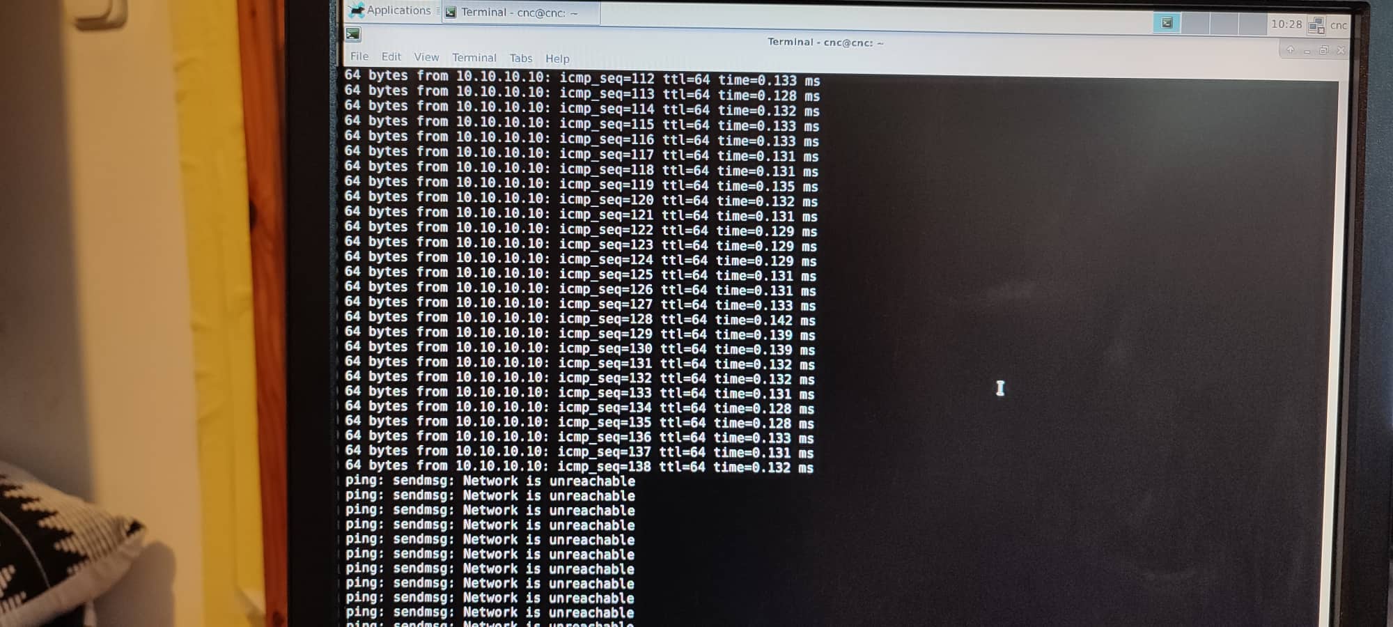 Ahh. I guess after restarting it multiple times I got I started mistyping it. But now Even when I type it properly I get the network is unreachable and the top right corner is constantly spinning (trying to connect). While it's trying to connect I am getting ping and "mesaflash --device 7i96 --addr 10.10.10.10 --readhmid" works too. but when it gives up and top right stops swirling and just shows 2 monitors with a cross I get unreachable. While its trying to connect the ping stays for a minute or so.