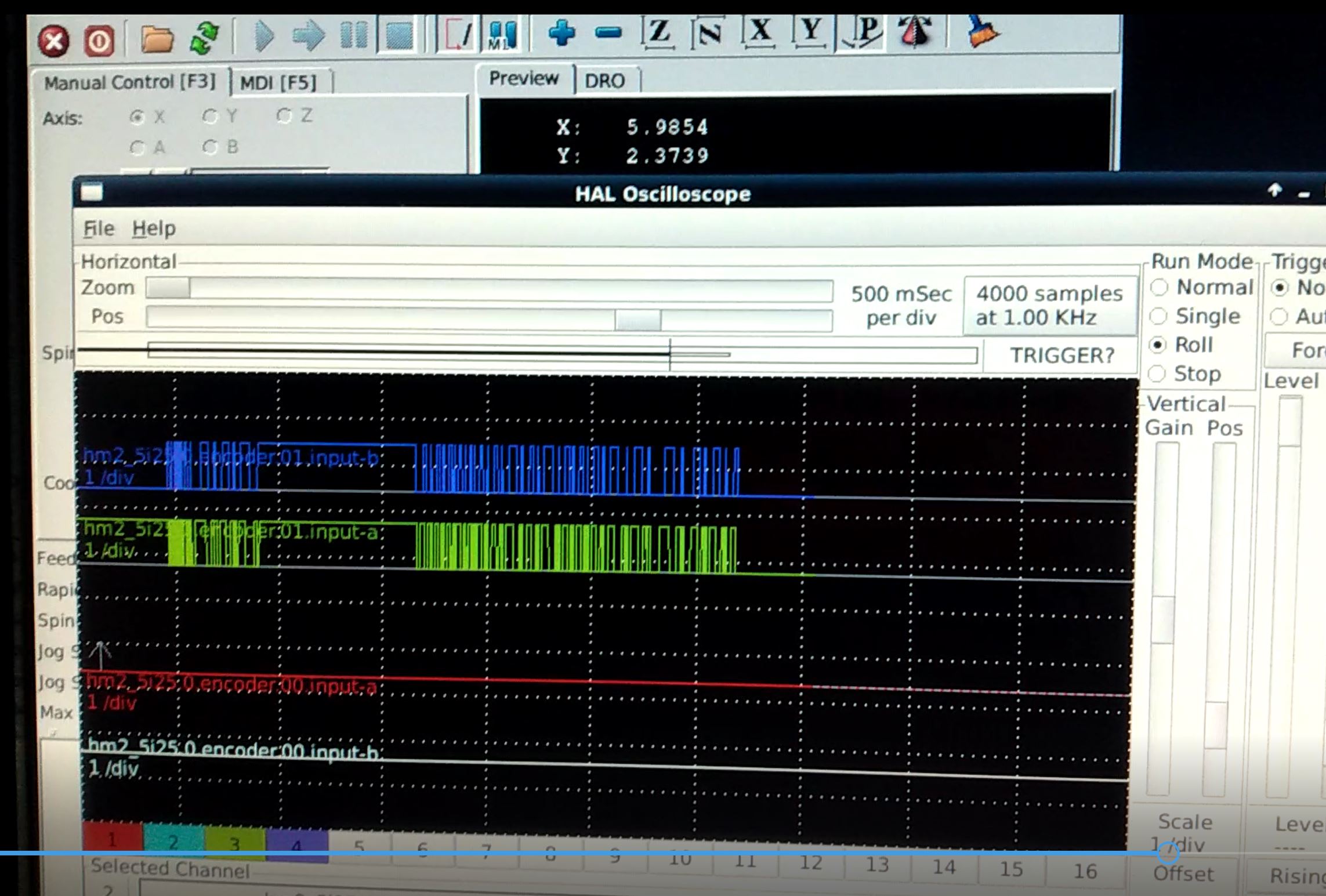 Hello everyone.I need some guidance on where to look next. The problem is my y-axis is not counting its only incrementing the last digit back and forth. The rest of the machine seems fine. I made a video of the halscope with the a&b channels of the both x-axis and y-axis in front of the axis GUI so you can see the position changing and not changing when I manually crank a handle, it’s too large to upload so I made a screen shot. X counts correctly but Y does not, the 7i77 seems to be receiving the signals from the encoders.