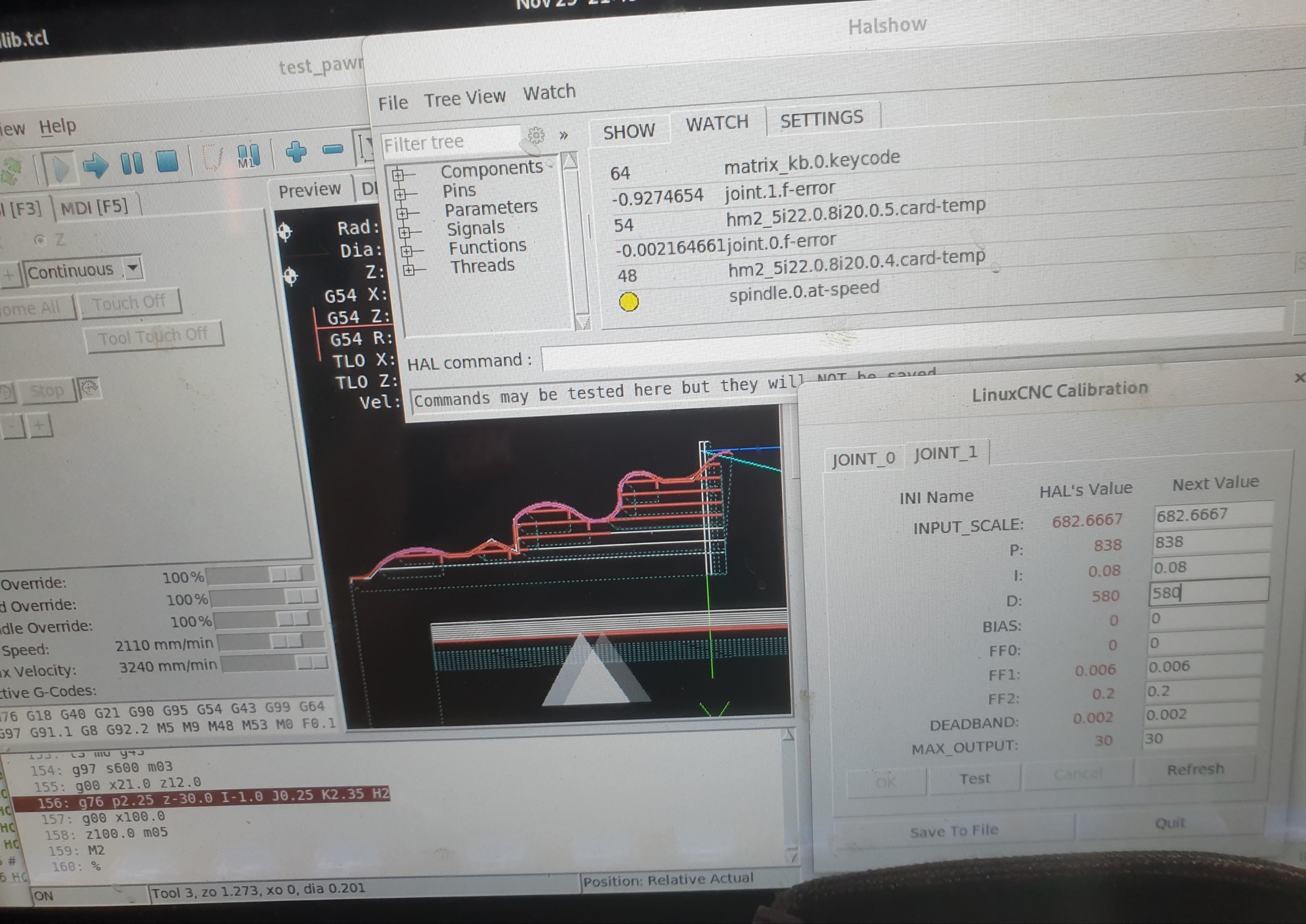 So I'm finally there with the shenyang machine I've been retrofitting. Currently boring a millimetre out of the spindle bore so I can fit a larger pull tube. As far as tuning the 8i20 cards I have a working set of pid values(I'll post a pic), I've read on the forum here that ff1 really dosent apply to torque mode drives. But after much testing and going cross-eyed, I found that if I put around 15. Something in it it took away the (I geuss) wind up, as in as feeding along the error would creep up to say 1.2mm then hold there. Whereas with around 15 in ff1 this would remove the issue. But, at a higher than 3000mm/min speed, I still get the same problem, it dosent seem to scale properly. Anyway any thoughts?the pic is before I put an ff1 value in.