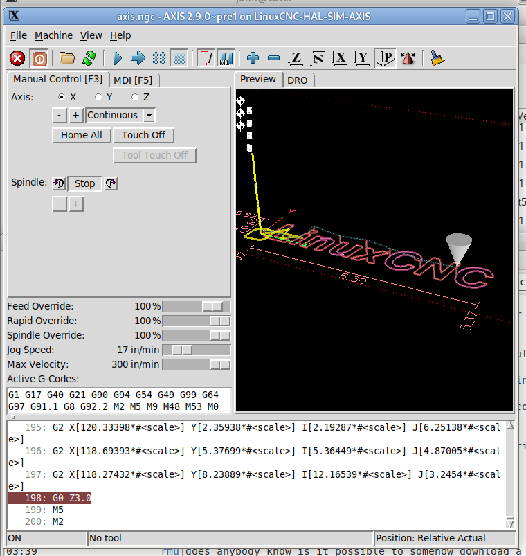 Machine configuration directory is '/home/john/linuxcnc/configs/sim.axis'