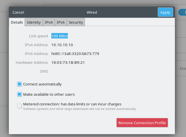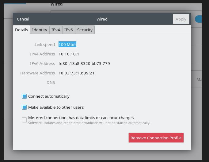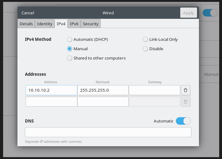In the IPV4 tab, set the IP address to 10.10.10.X