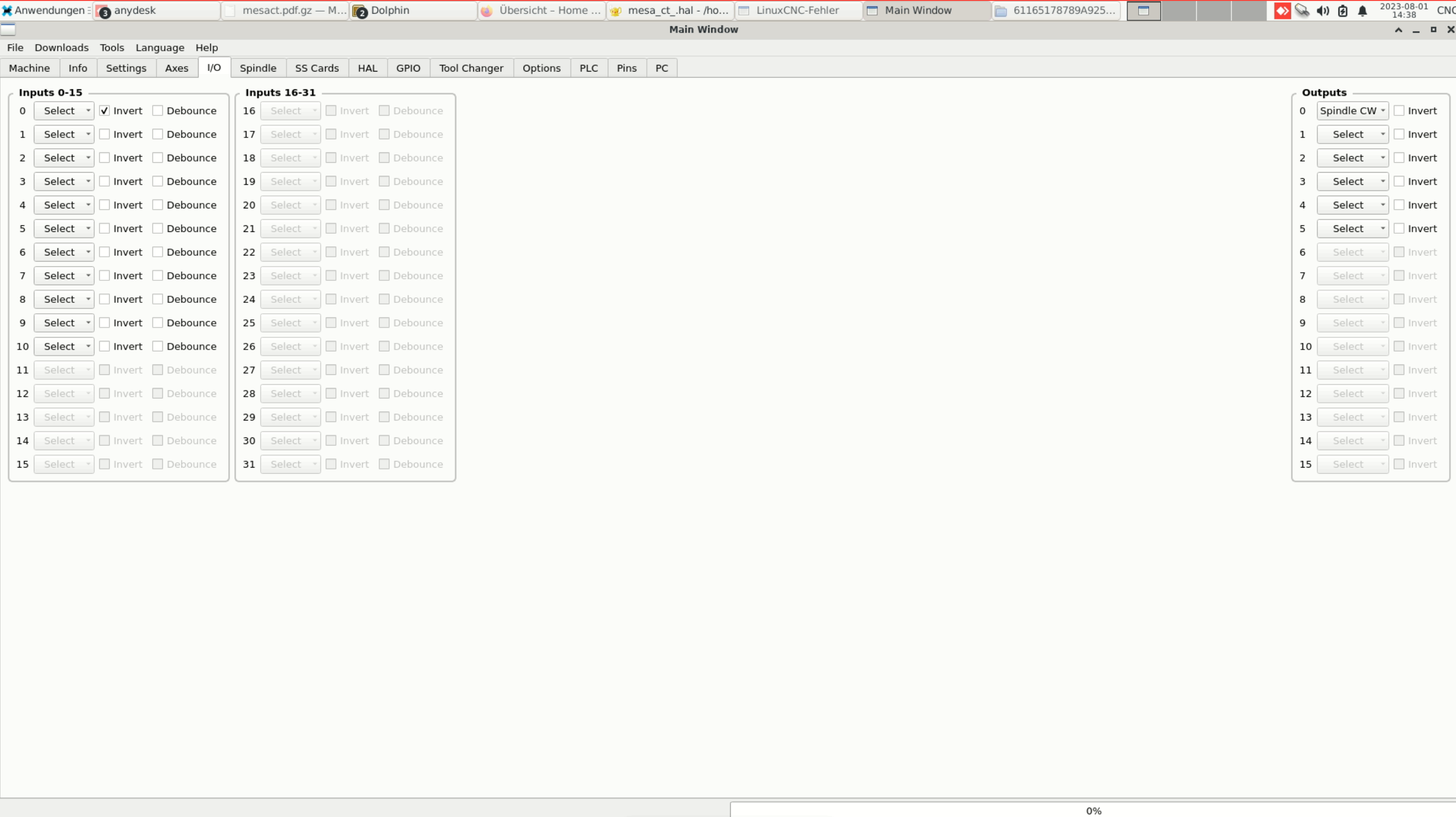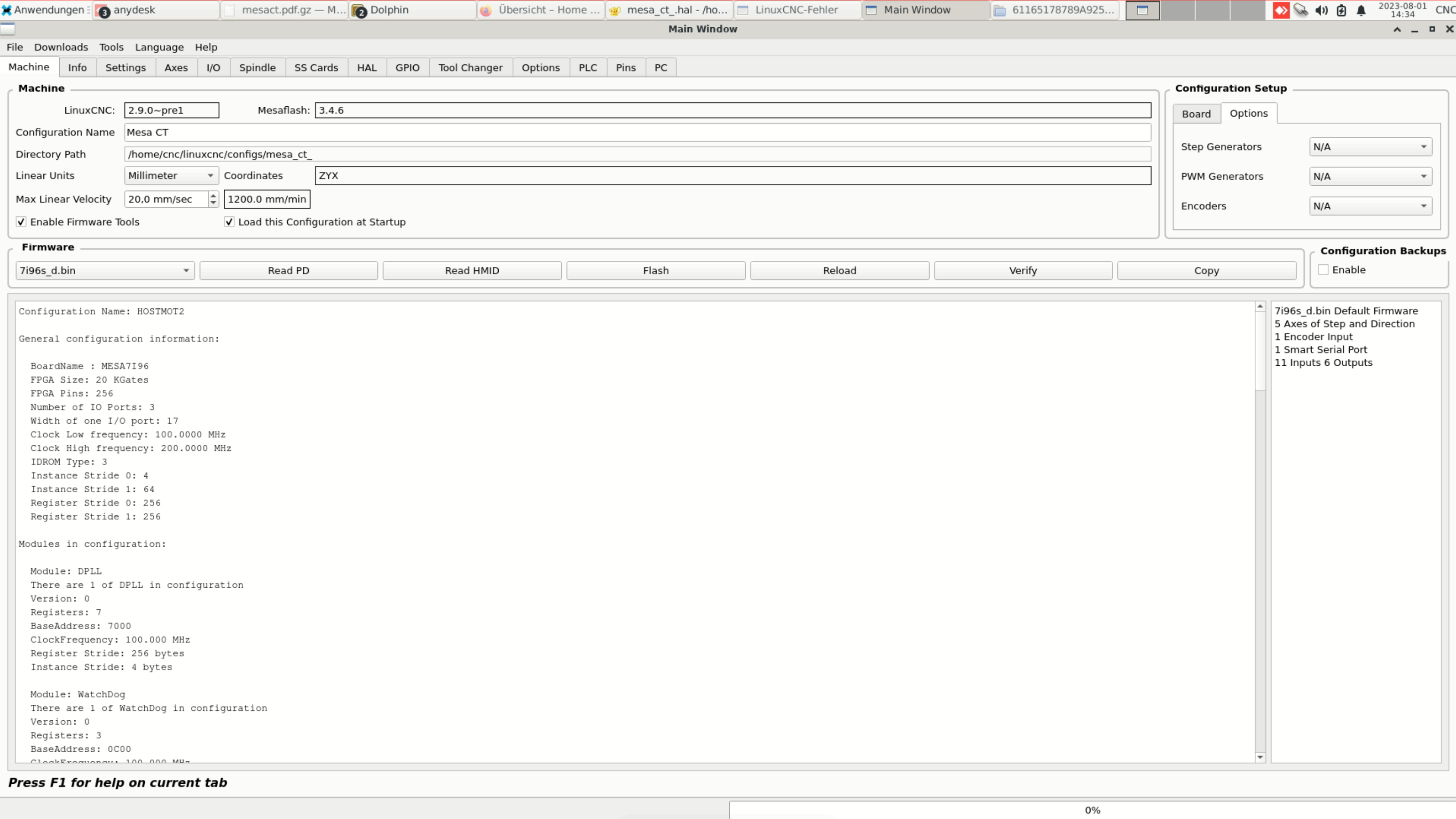 I am in the process of familiarizing myself with the MesaCT tool. The machine can be started and the axes can be moved.