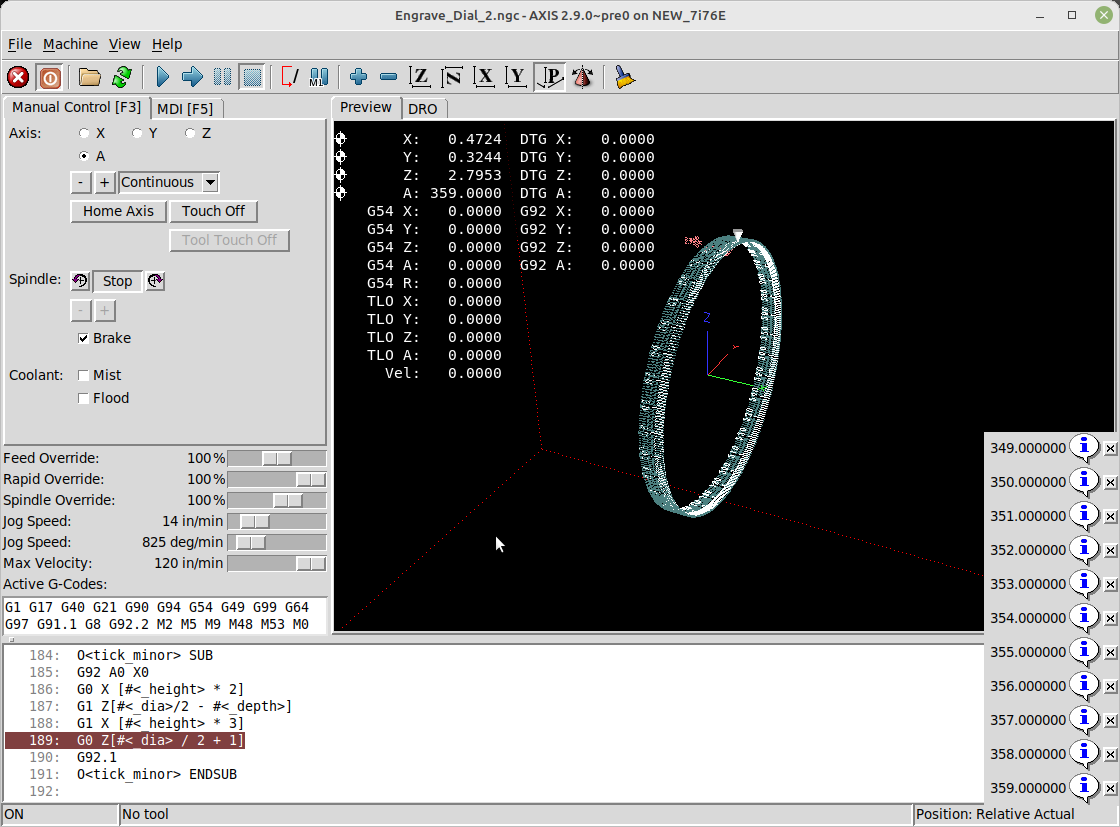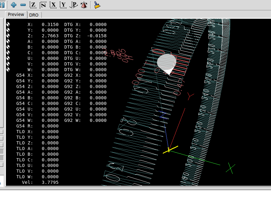 ) character is included in the GEOMETRY string, display points for A, B, C rotations respect the X, Y, Z offsets set by G5x, G92 codes. Example: Using!for a machine withGEOMETRY = !CXZ. This provision applies for liveplots only — G-code previews should be done with zero G5x, G92 offsets. This can be facilitated by setting offsets in programs only when task is running as indicated by #<_task> == 1. If nonzero offsets exist at startup due to persistence, offsets should be zeroed and preview reloaded.[TRAJ]COORDINATES=XZC