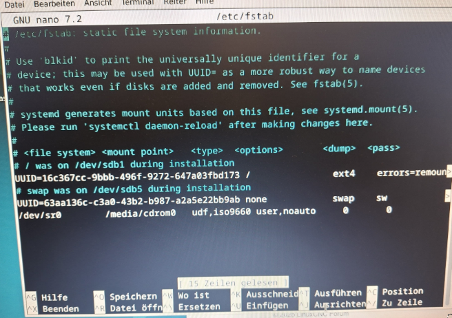 Hallo tommy,ich habe sudo nano /etc/fstab ausgeführt und