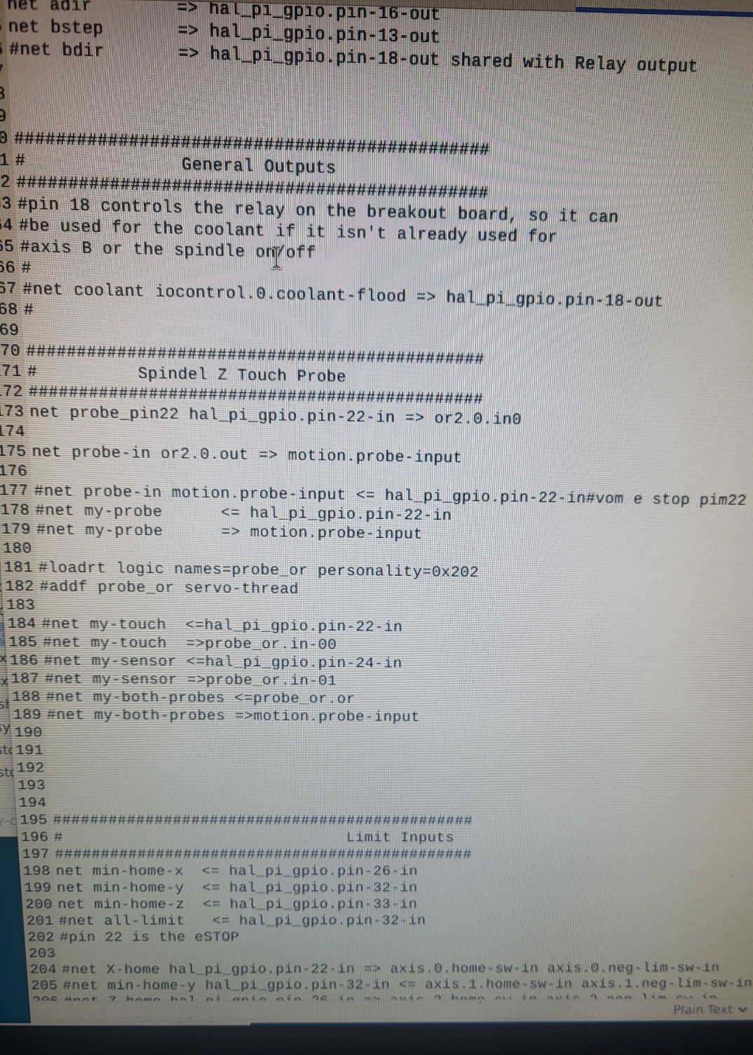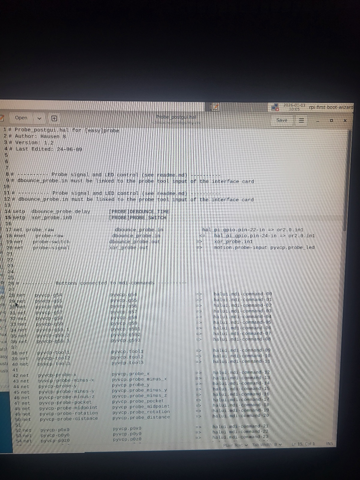 nutzen ,die haben aber beide den gleichen Namen probe input pin. Den 3d taster habe ich auf pin 22 .funktioniert einwandfrei solange wie ich den pin 24 auskommentiert habe ,wenn ich ihn nicht auskommentiert habe startet das Programm nicht ,es kommt der Fehler probe pin bereits vergeben wie bekomme ich das gelöst .der eine wird in der Maschinen hal angegeben und der andere in der postgui.hal. Wie kann ich das Problem lösen?