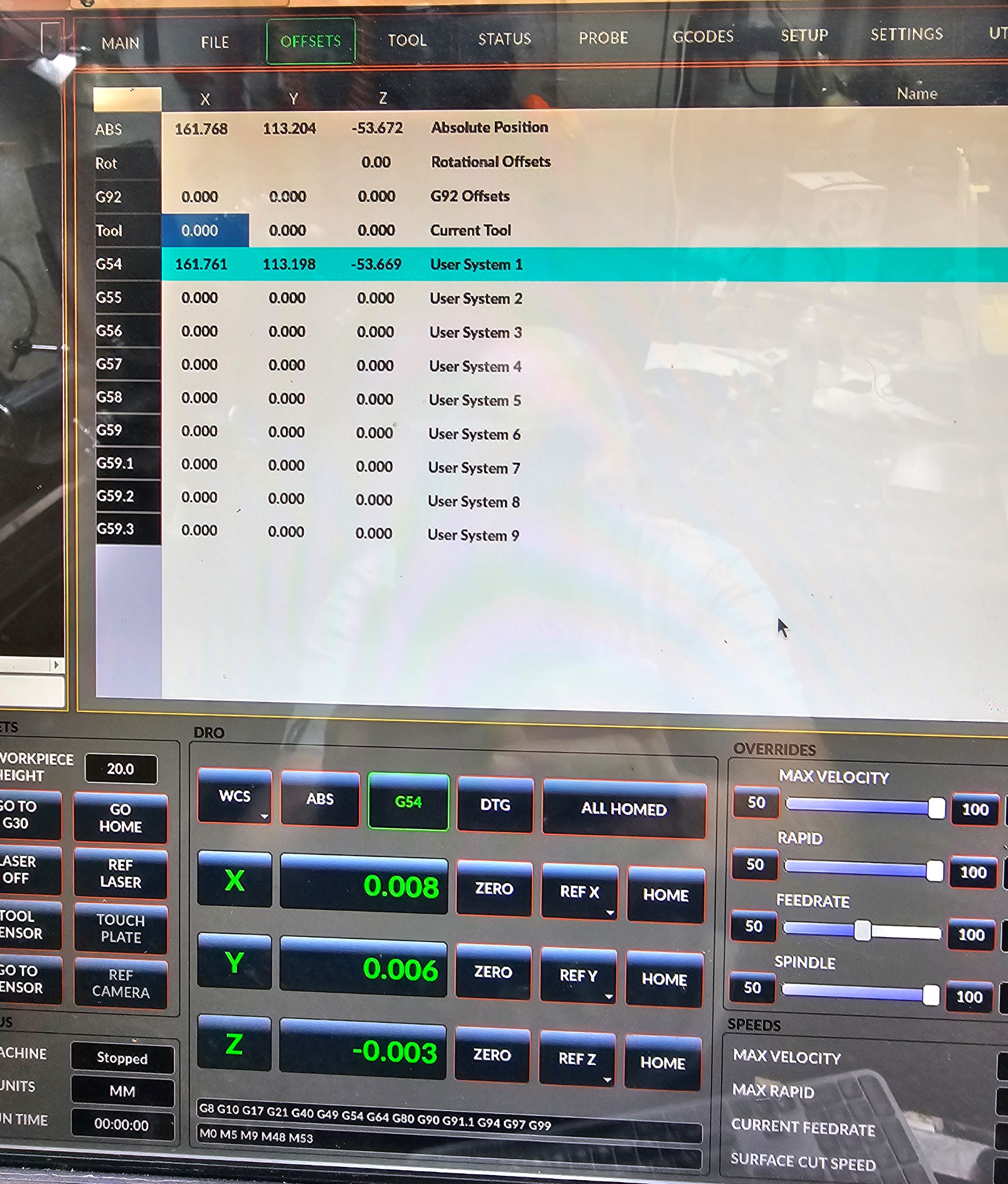 I have managed to get everything working pretty much as before and axis all home correclty and the home co-ordinates are all set to 0. If I then jog the table to a position and press Zero on any of the Axis the G54 Cordinates are not zeroed. See attached pictures.