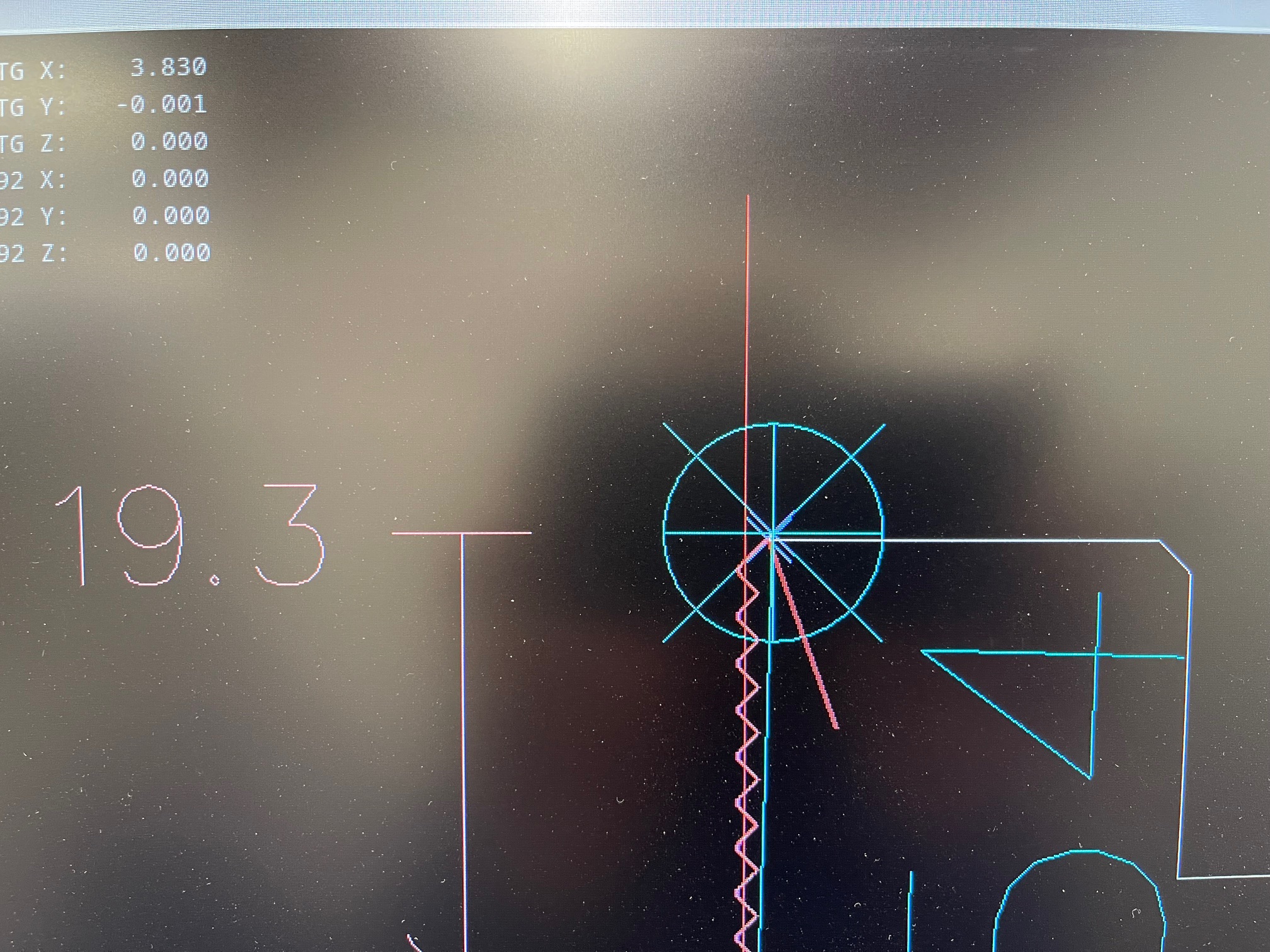 The second photo really confused me. Here, the cut "started" at the free end of the red diagonal line, moving toward the upper left corner of the workpiece (note that this is inside the workpiece). Also note that neither of the X markers is at the start of the red line. While the red diagonal line was extending, the physical cutter was Not moving. The red line continued until it reached one of the X's and then began following the contour of the cut. The crazy thing is that the physical cutter Still wasn't moving and didn't until the red track came down even with its start. Only then did the physical cutter contact the work. As a result, the entire workpiece ended up missing everything above that point.