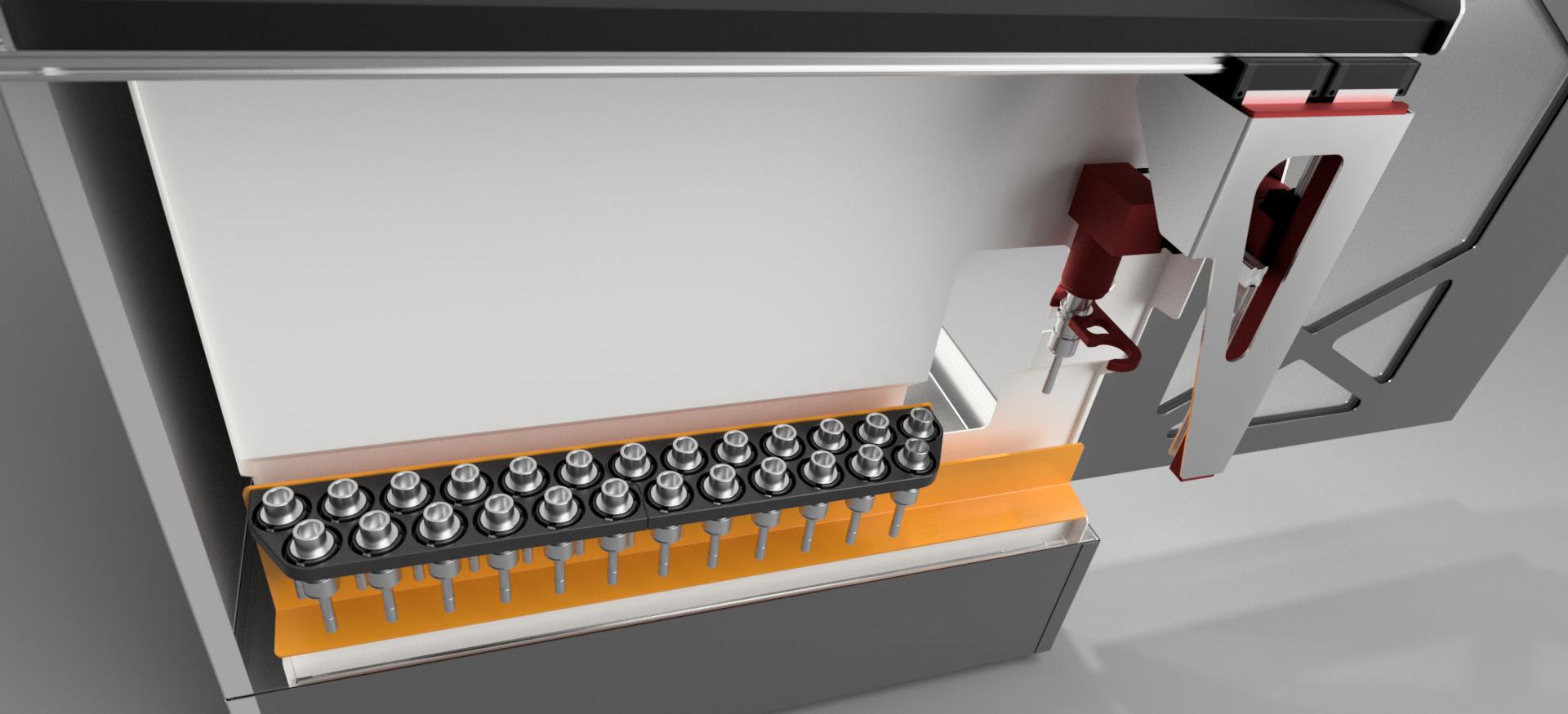 1: Robot on its own goes to grab the next tool needed by the machine, and places it in the arm SLOT A