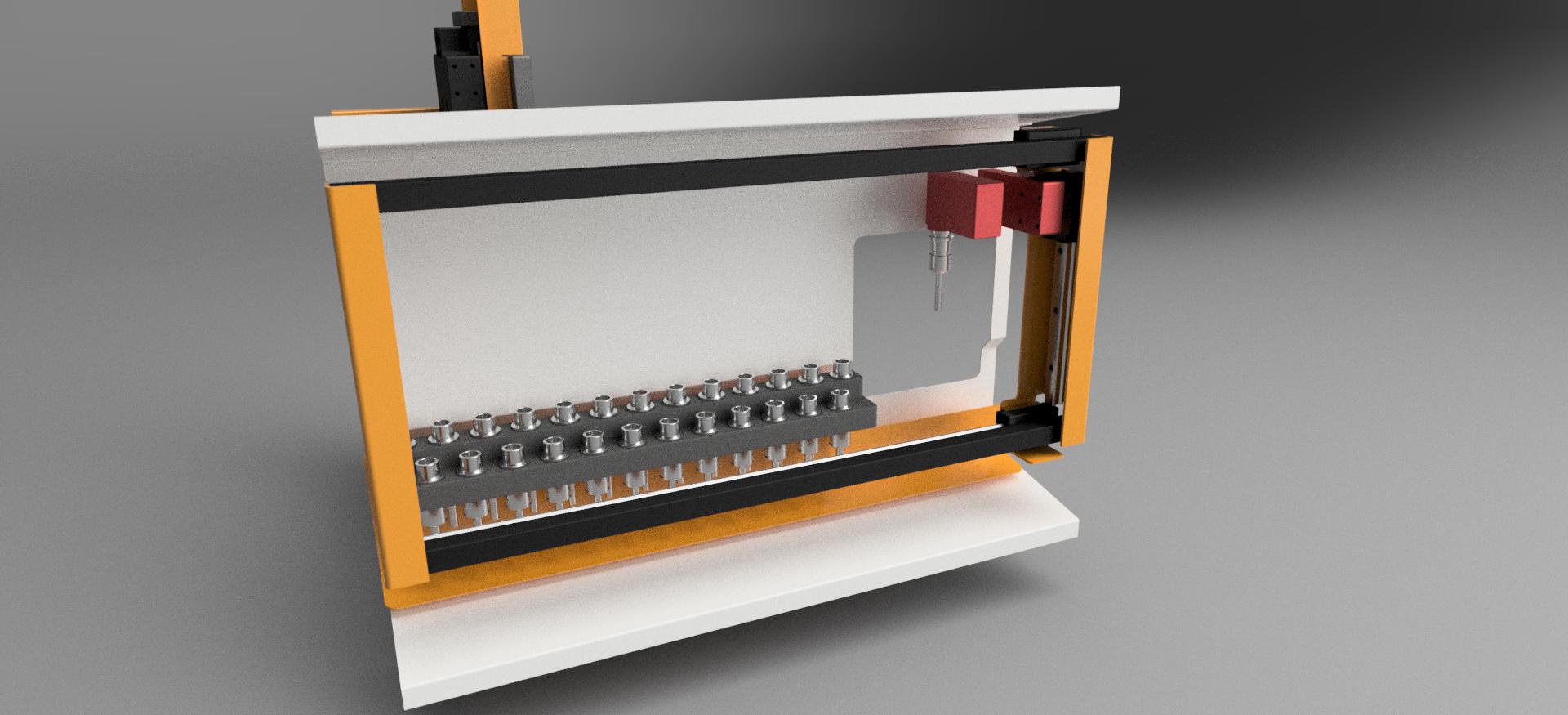 So we have wound up with a simple little 3 axis cartesian robot. Robot basically has a spindle taper and air powered gripper, and then hands off to a switcher arm that will be moved by the little robot with a roller cam.