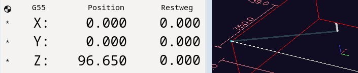 What I'm seeing is that I set all three axes at 0, then it switches to G55, and I very strongly think the G10 offset should read G10 L20 P2 X-30 Y0 Z0. If I do that, it runs to X-30, Y0, Z3. In all the subsequent, identical, work offsets, it also runs to Z3.