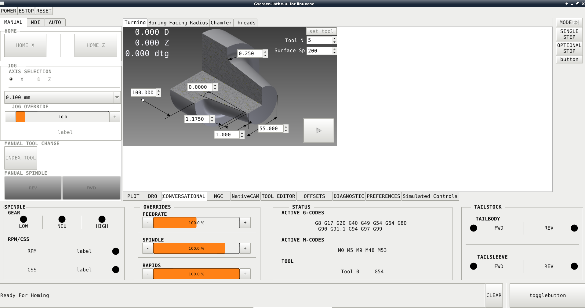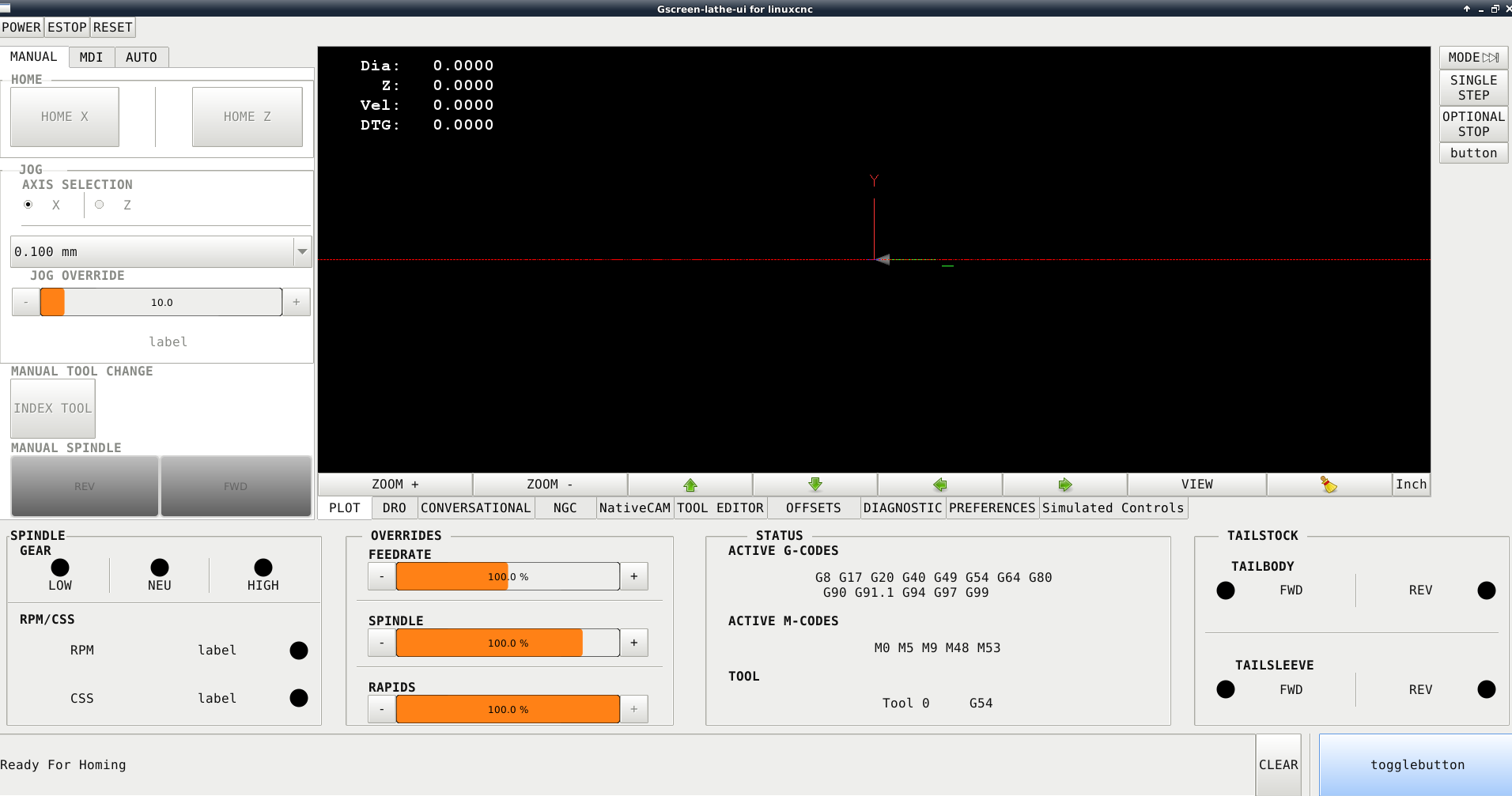 Well, here's another kick at the cat for a custom gscreen skin. It's pretty similar to gaxis, meant specifically for a CNC Lathe that has a Hydraulic