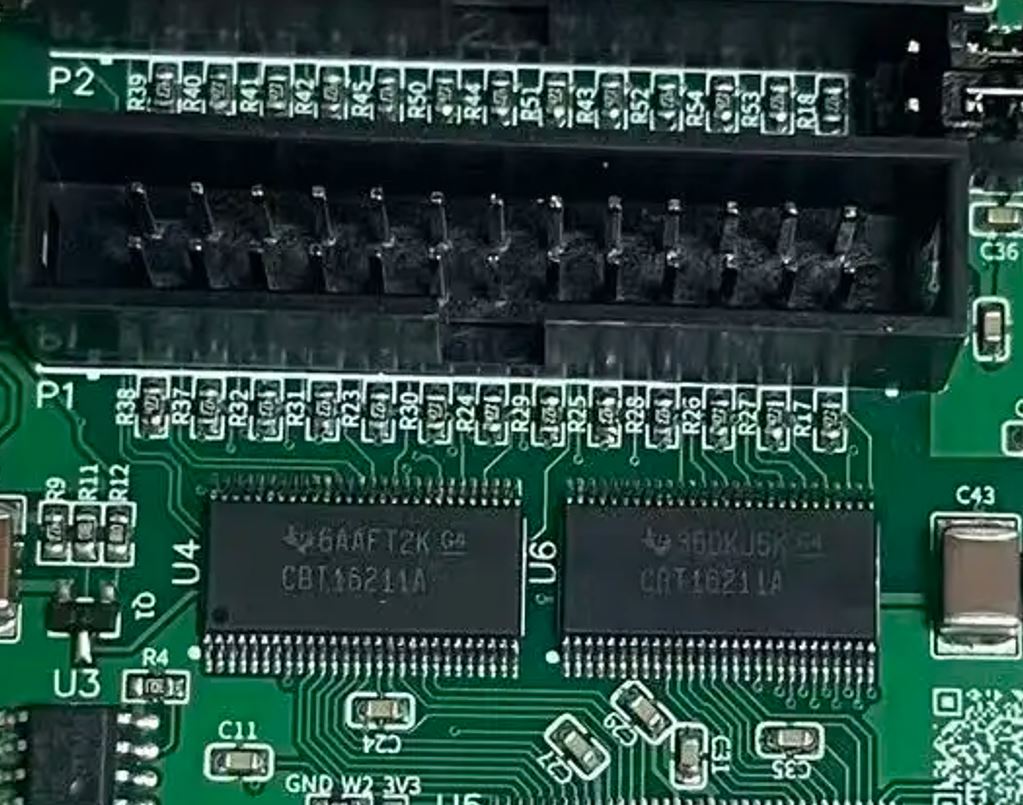 Die Chinesen scheinen bei deren Karten den falschen Busschalter verbaut zu haben: CBT16211A statt CBT16211. Laut Datenblatt ist das ein reiner Schalter ohne Pegelwandelfunktion, müsste also entweder gegen welche ohne A getauscht werden, oder die Pins dürfen nicht mehr als 3.3V sehen. Die chinesische 7I92 hat Vorwiderstände an den Pins, vermutlich weil den Chinesen beim ersten Test die FPGA-Pins wegen zu hoher Eingangsspannung gestorben sind. Falls die Widerstände 220Ohm haben, weiß ich woher sie die Idee haben