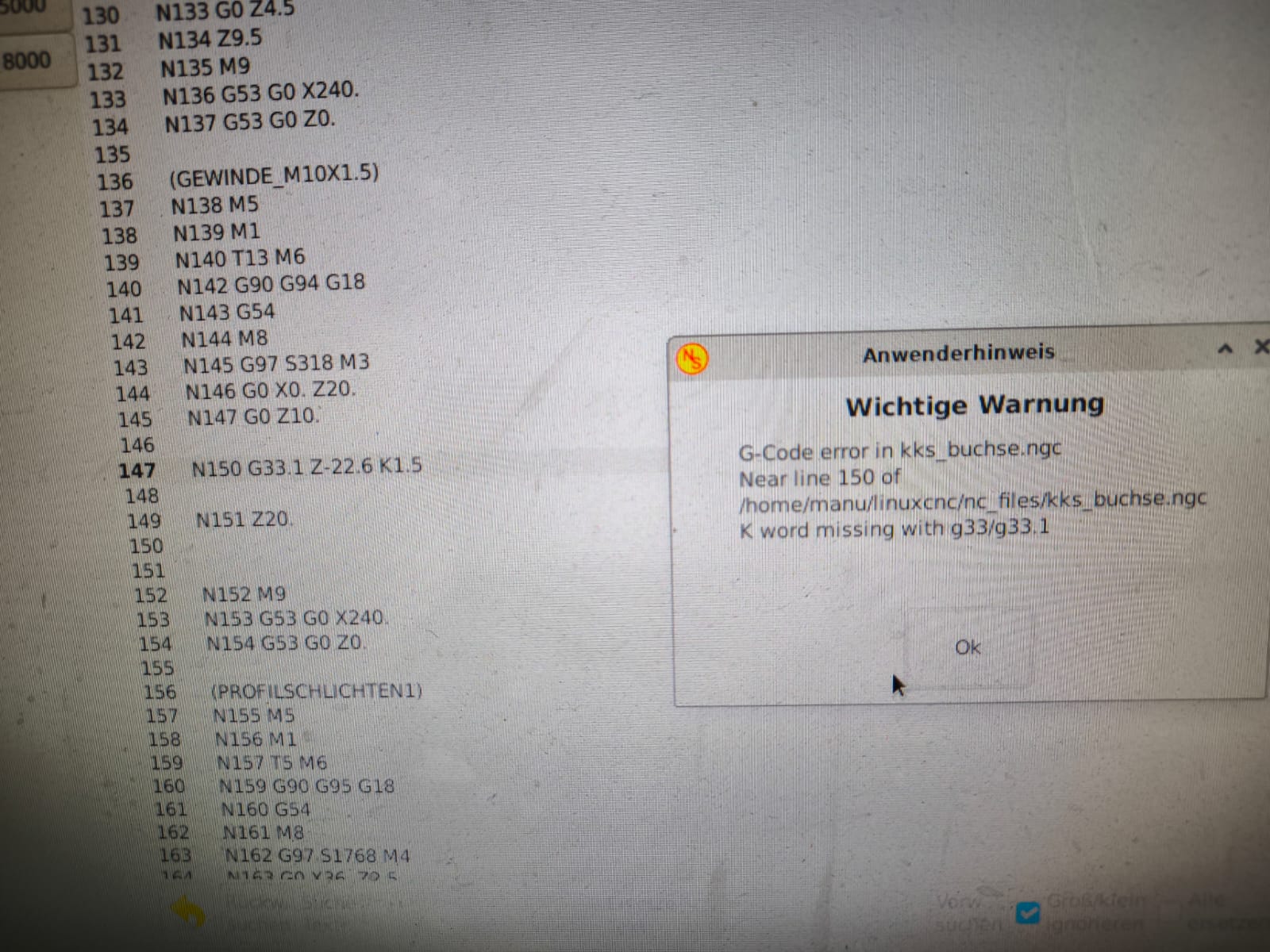 beim Gewindeschneiden mit 33.1 wird eine Fehlermeldung ;missing k-word" ausgegeben, obwohl es vorhanden ist.