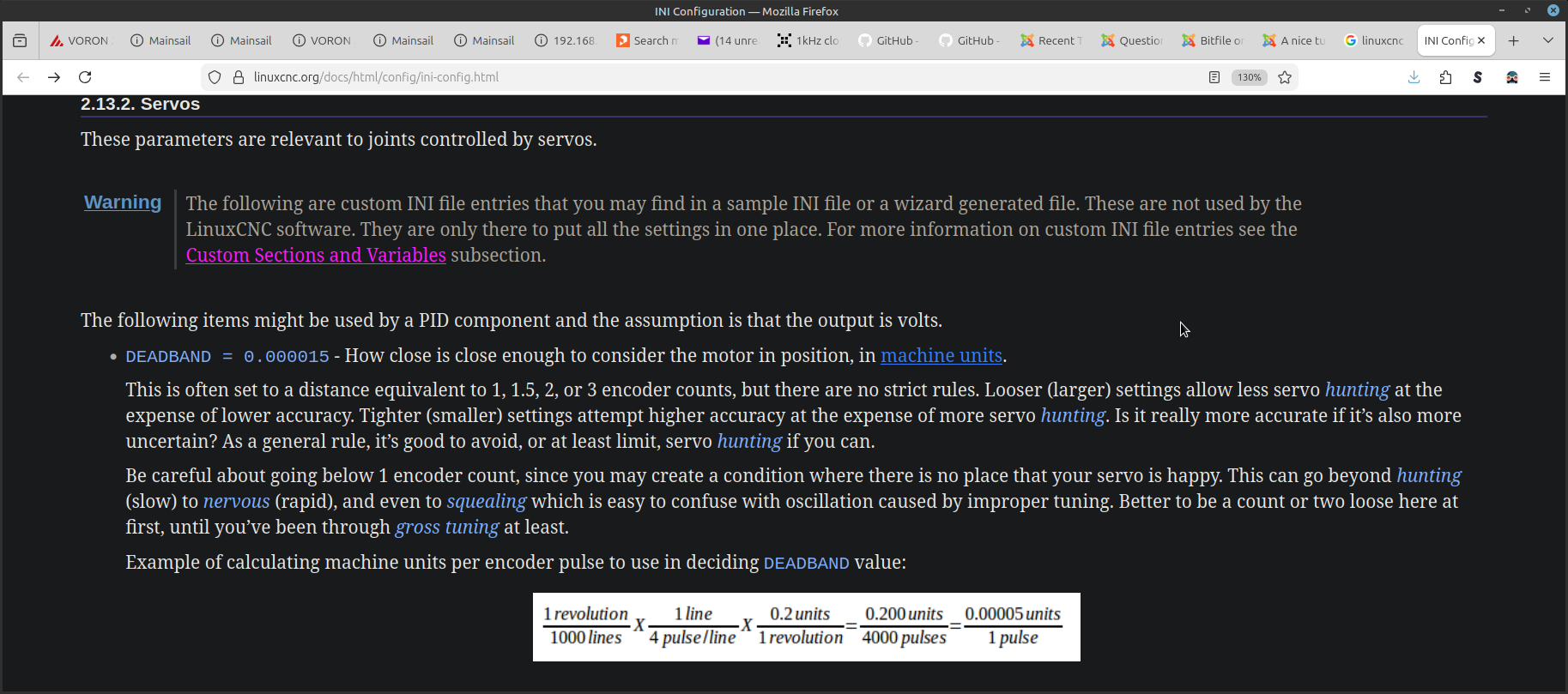 Hello everyone,I have a question regarding the use of deadband in the calibration function.I am using a Delta servo motor. Previously, I ran the servo drive in position control mode (pulse train input), using a Mesa 7i77 for feedback control. In that setup, setting the deadband to 0.003 worked well and the motor was able to stay still without hunting.Recently, I changed the servo drive mode to speed control using ±10 V analog input, because I expected smoother motion compared to pulse train control (this was suggested to me earlier). After that, I modified my HAL and INI files to use analog ±10 V output instead of pulses.The problem is that I can no longer get the motor to stay still using deadband.When I apply any value to the deadband, the value of joint0.f-error immediately jumps to the deadband value, and the motor still shows oscillation near zero error. It feels like the deadband is not helping at all—in fact, it seems to make the behavior worse. The motor still dithers or ripples at the error endpoint.My question is:
