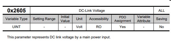0x2605 works just fine: that's the DC link voltage and I can read that from all 3 drives.