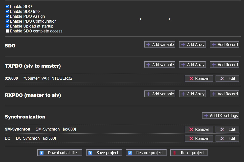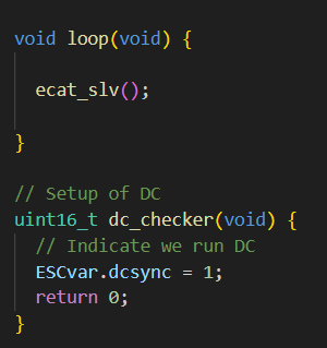 ecat_slave_init(&config):ESC_init();For the EEPROM, sdos and pdos and all that there is a utility in Utils/EEPROM_generator. Bring up a file manager view and double-click the index.html to open it in a browser. Here you enter SDOs and PDOs. Save all and unzip all files into lib/soes-esi and it will be picked up be the code if you used the stanza I have. I think you can program the new eeprom with "ethercat sii_write eeprom.bin". I usually copied the esi file to Twincat and programmed it there, but lately I have used siitool with the -m flag, so siitool -m < xml-file > eeprom2.bin and the ethercat sii_write eeprom2.bin and that have work.