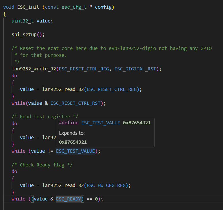 Use the debugger and verify that you read 0x87654321 from LAN9252 on line 445 in the figure