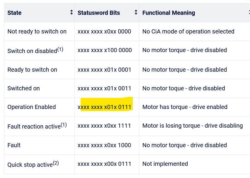 Some of the statusword combinations are belwow