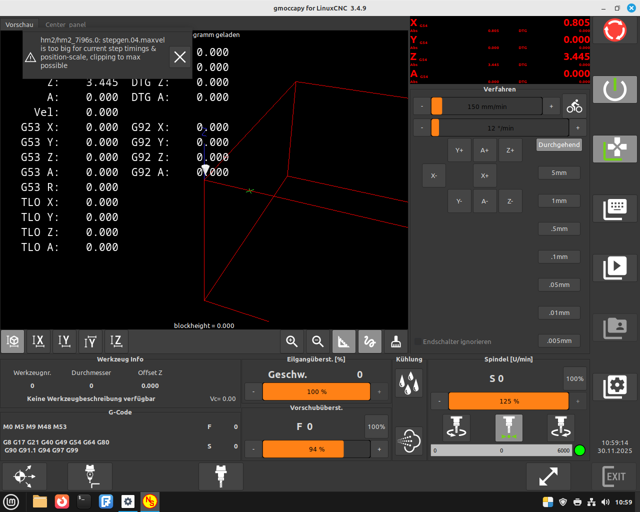 The second problem concerns the SRO rotary encoder. The spindle and the normal feed work, but the rapid-feed encoder does not. Even when I swap the inputs for feed and spindle, it still doesn’t work. It seems to be an issue with the GUI/interface? Where can I start looking to solve this?