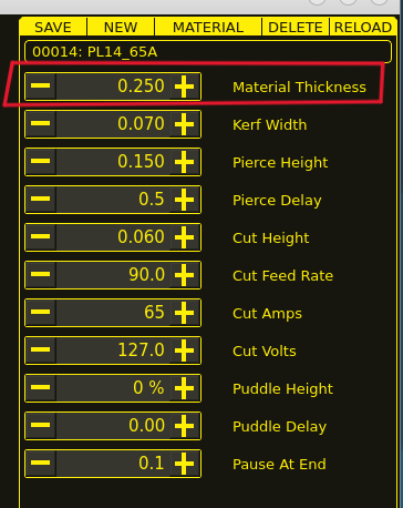 The qtplasmac-imperial_material.cfg file has the material thickness added, it has the settings for a Hypertherm Powermax 85.