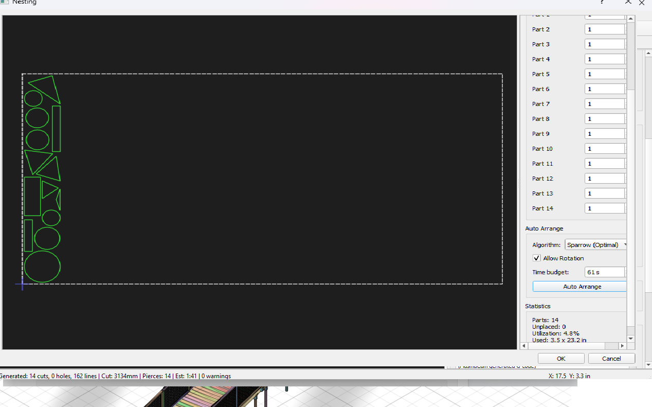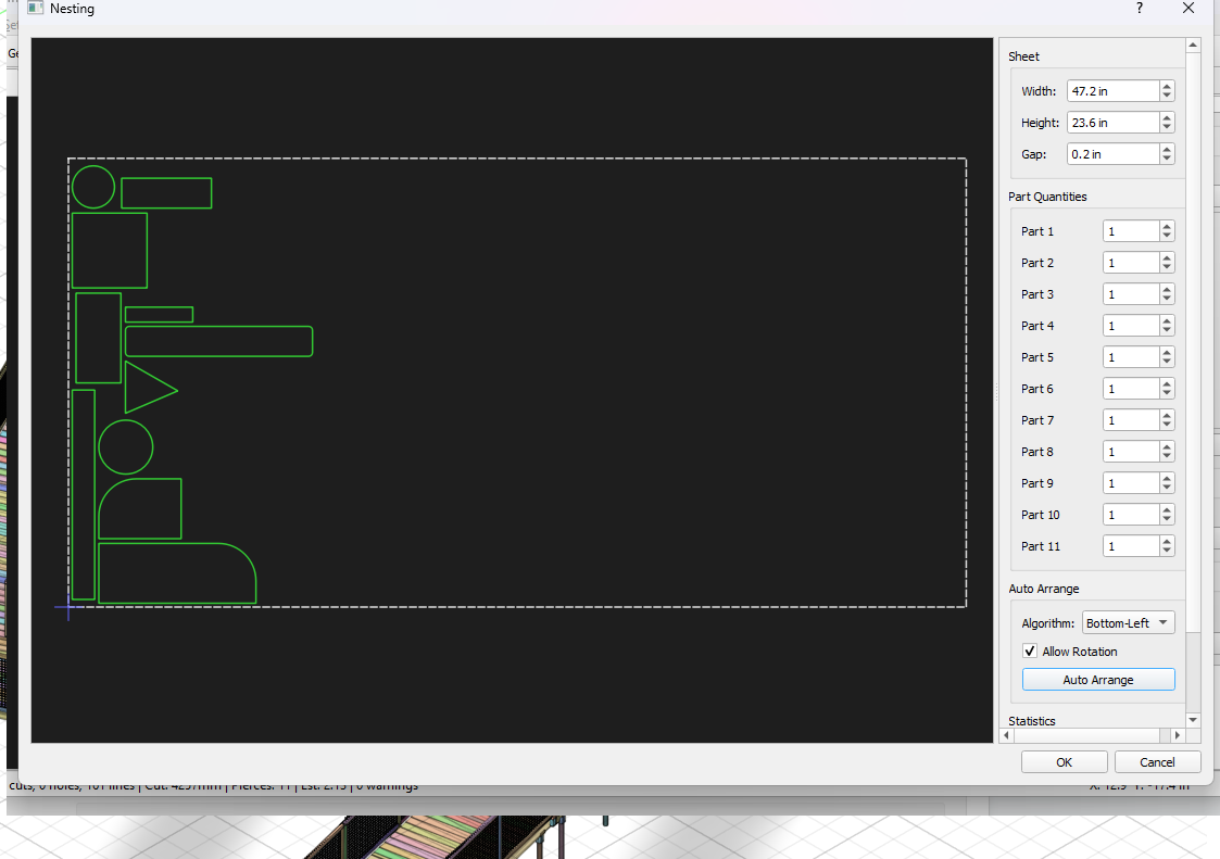 Here is updated nesting using sparrow algorithm. Im also including the github repo for anyone who wants to use the software or work on the software. If you make any changes you would like to share make a github and include them here and I will test and implement them into the main build. To build the software I am using claude code, pretty much just text to code dont have to be a genius just good at coming up with ideas a 20 dollar subscription to the ai and some free time on your hands.
