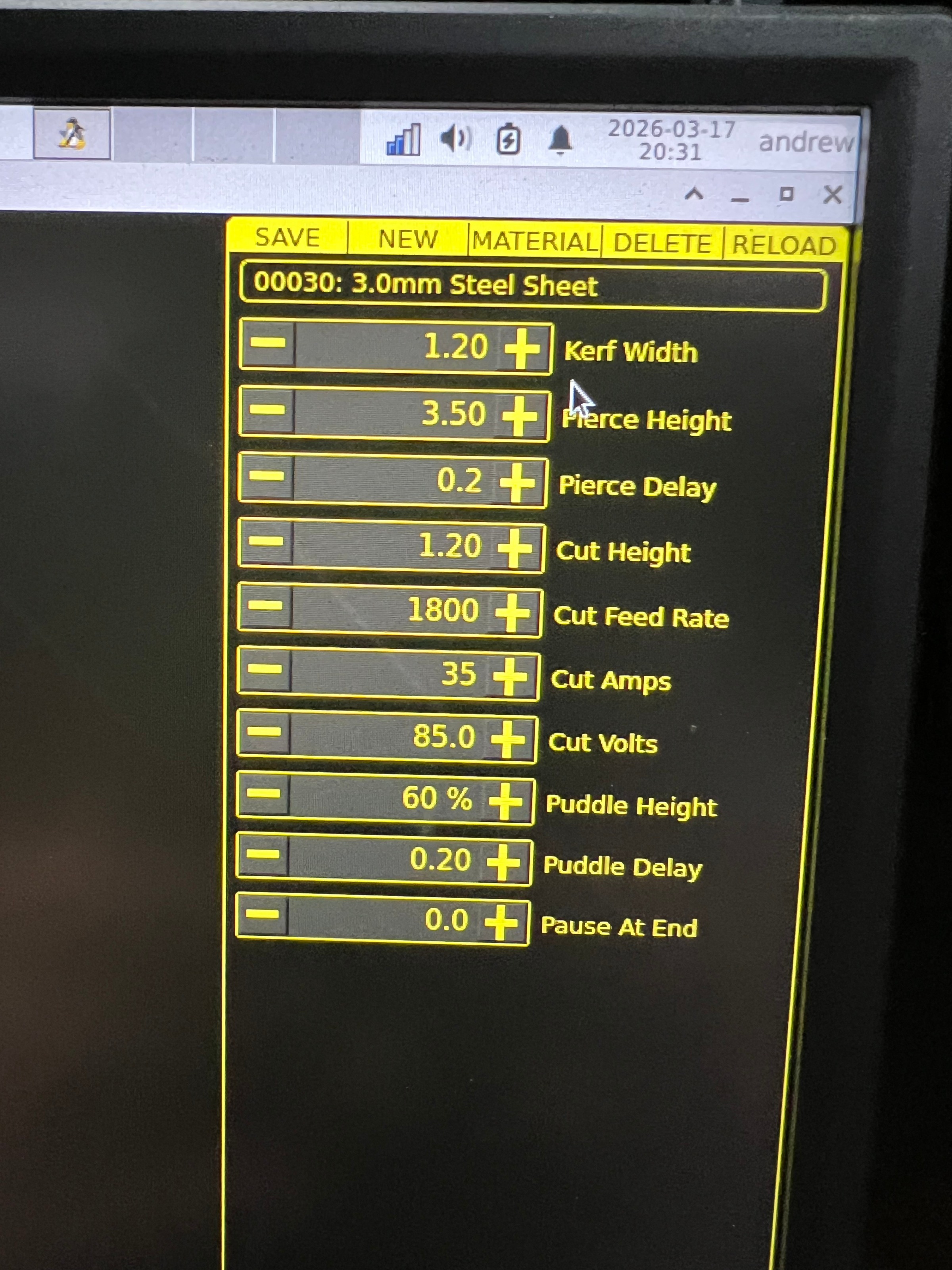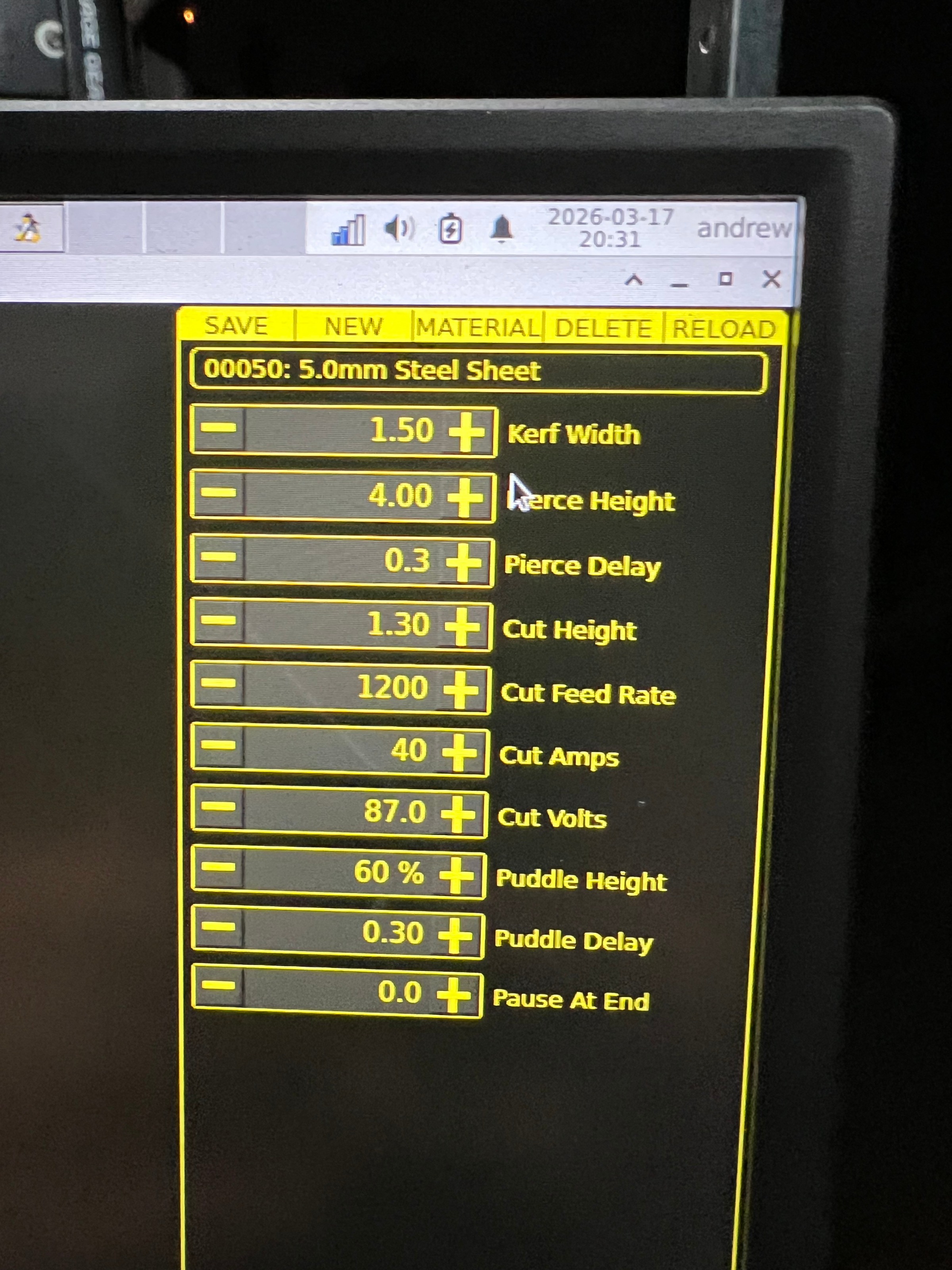 Hi all, Firstly great crowd. Love your work.Ok so I have bult a table. Setup is as follows: 1.2mx1.2m cutting capability. Mesa 7i96 card. THCAD2 THC, Unimig Razorcut45 CNC enabled cutter.X Y, Y1, Z config. I have set the THCAD2 to 1:1 10v High status, and the Unimig at a 30:1 ratio, which should produce a roughly 5V at top end signal. I do not have any resistors in the mix.I have the cutter running but only WITHOUT THC. It cuts, BUT it does not do this nicely and I do not know how to best tune the system. I started on 5mm steel. (probably a little ambitious.). And I dont have enough knowledge on how to set the speeds, heights etc.. to get a clean cut before THC. Then I will need to solve THC. But thought best to get basic answer on settings for the 5mm first then the THC. So settings are as per the images below. I have not performed any other settings other than servo setups and max speeds. Unimig fires off, so Arc on/off work. Arc OK seems to be ok as when has no steel, it shuts off. THC yet to get working.
