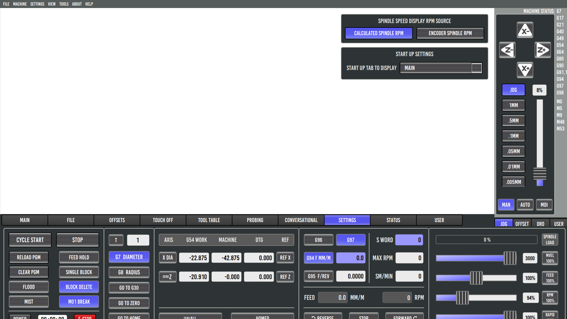 Also, the arrow keys only respond when clicking with the mouse in certain specific areas.To have the spindle rotate at a default speed of X RPM, I set