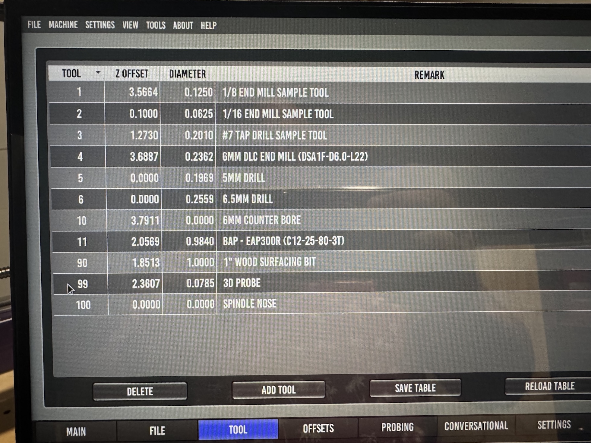My machine overall is a router style setup with a 30 in x 30 in work area. My spoil board is ~24 in x24 in. The spoil board corner is not at (0,0), well inside the machine soft limits. My tool table only has Z offset and Diameter. After probing the corner of the spoil board, the G54 offsets were: X=5.0161, Y=1.1693, and Z=-7.4953. Z probe Z offset is 2.3607 and cutting tool Z offset was 1.8513.what is your machine setup like regarding tool offsets?