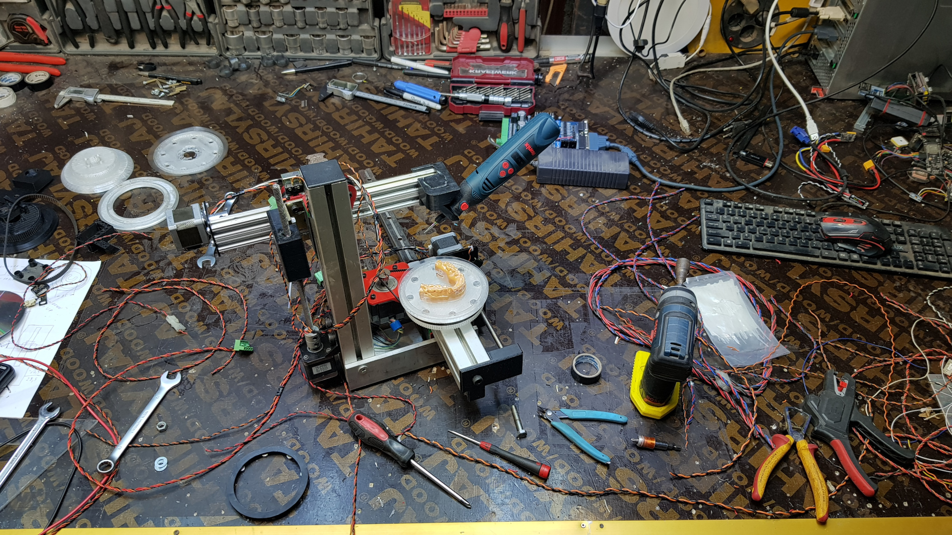 This is what i was doing last few days, a very small 4 axis cnc machine for cutting some kind of plastic material for clear teeth aligners, machine is fully finished (except a box for electronics and cutting the protruding HGR25 rail to size).